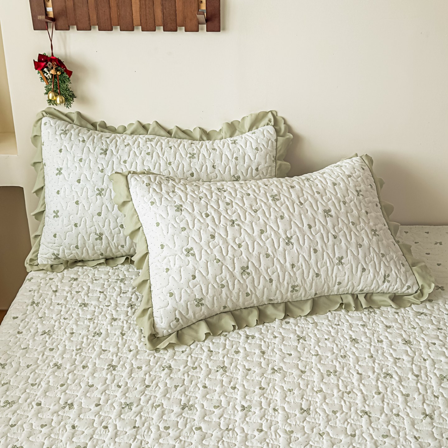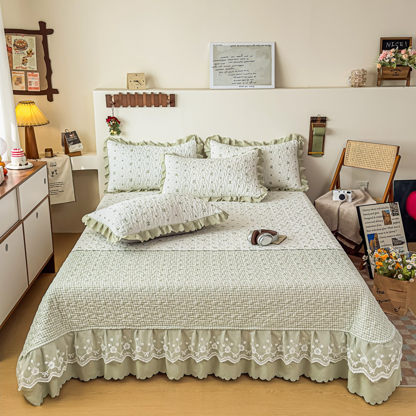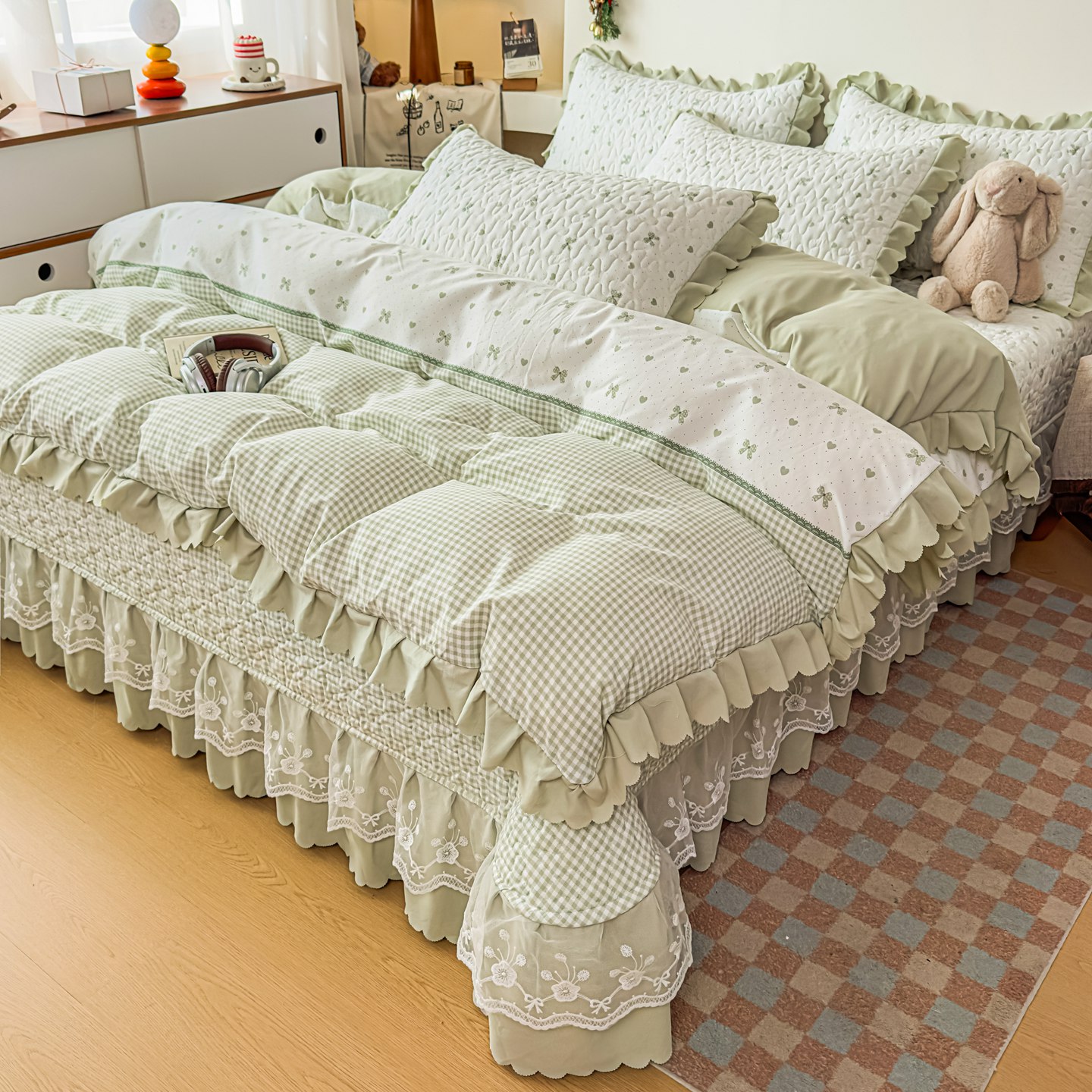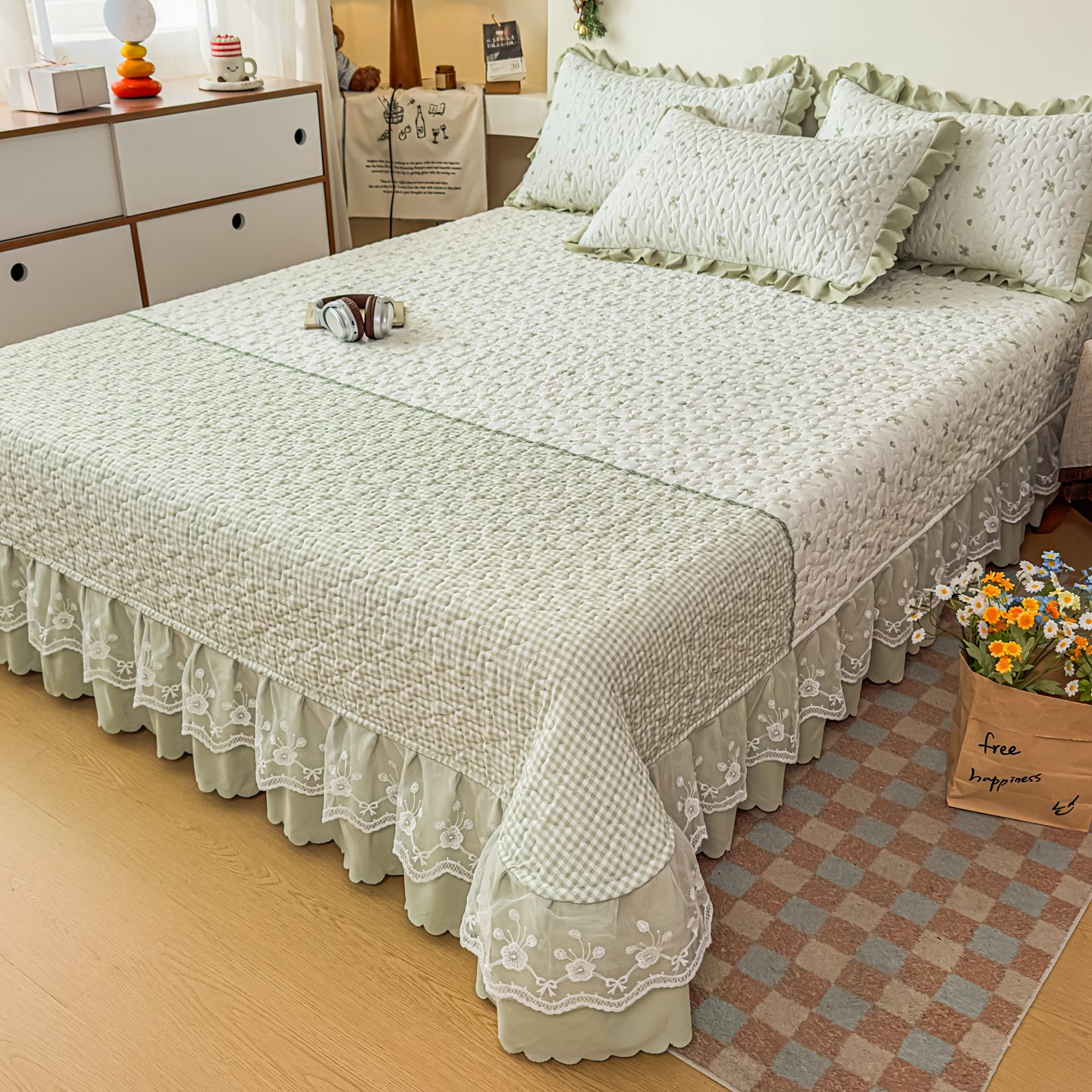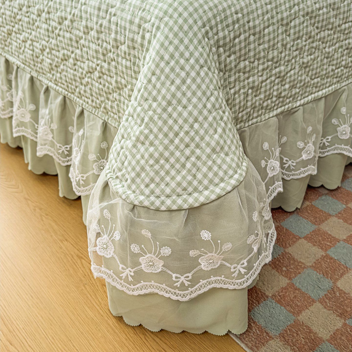 雅眠居 2026新款直播爆款古法仿棉双层蕾丝花边床盖四件套 彩格-绿