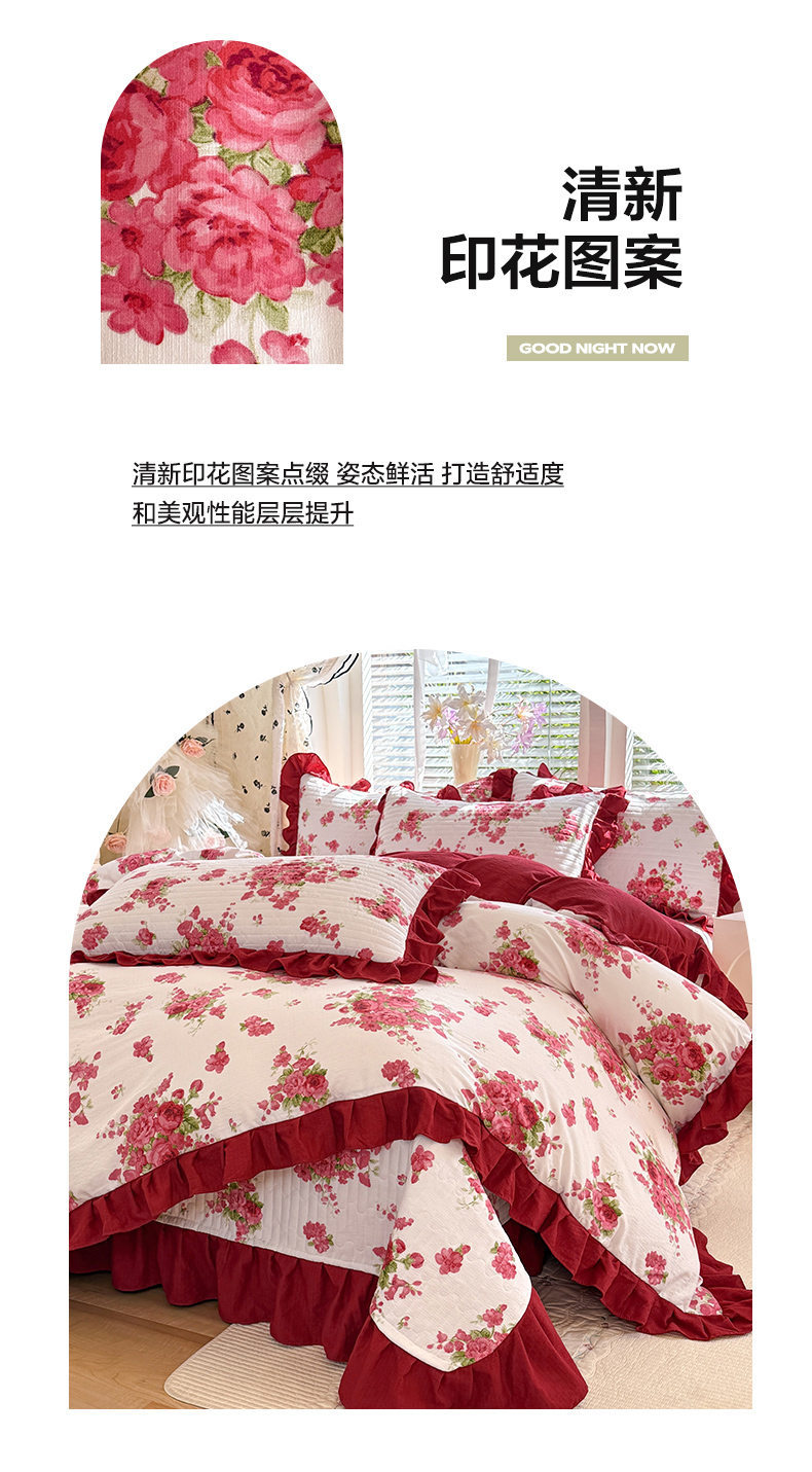 当前位置: 91家纺网 > 商品网购 > 床品套件 > 四件套 > 水洗棉四件套 > 唐人居 2026春夏新款皱皱水洗棉花边床盖四件套 玫瑰园