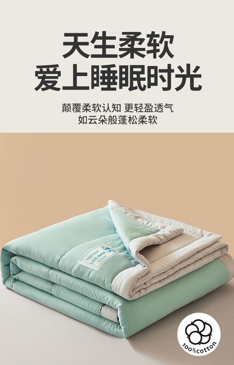 商品名称:罗布斯 2026新款简约纯色风水洗棉双拼夏被新疆棉花被夏凉被空调被(买家秀加微) 青果绿拼灰