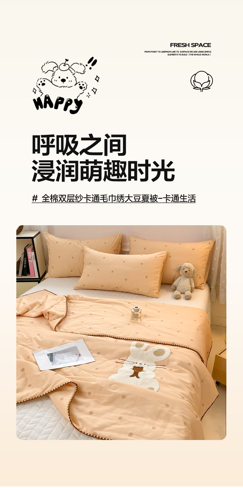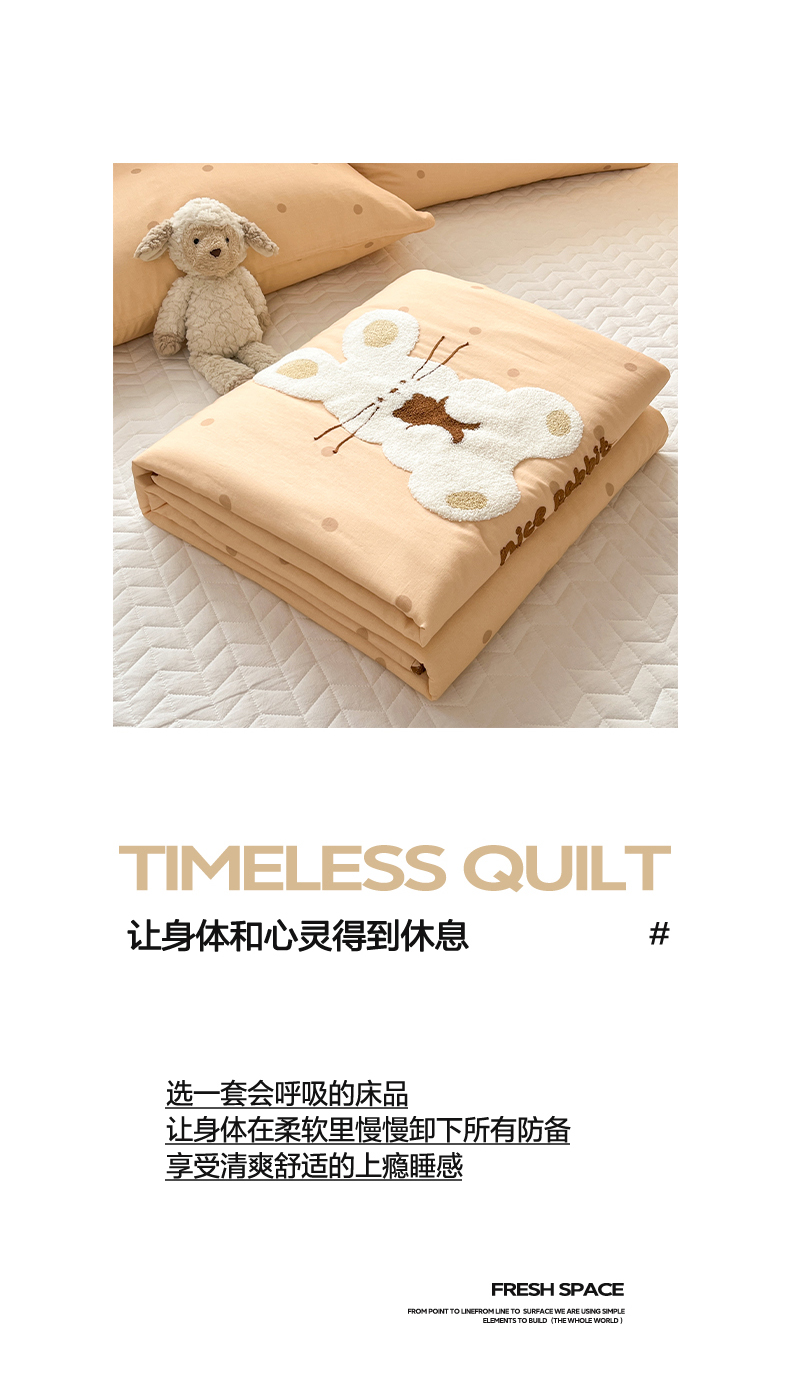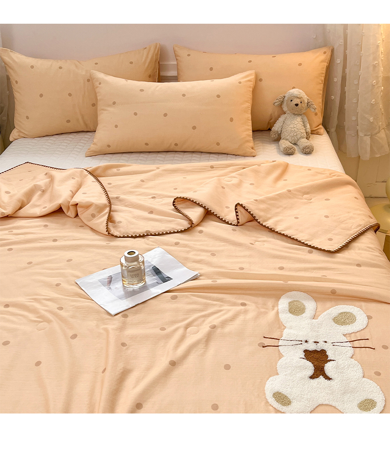 商品名称:一加一 2026新款全棉双层纱卡通毛巾绣大豆夏被夏凉被空调被-卡通生活 抱熊小兔