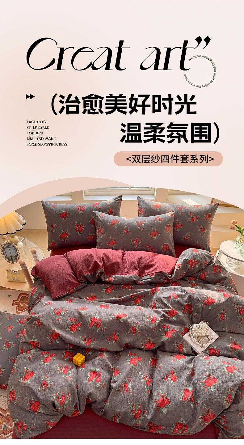 当前位置: 91家纺网 > 商品网购 > 床品套件 > 四件套 > 化纤普通四件套 > 悠米悠家 2026新款亲肤舒适木棉双层纱印花四件套 绯烟絮语