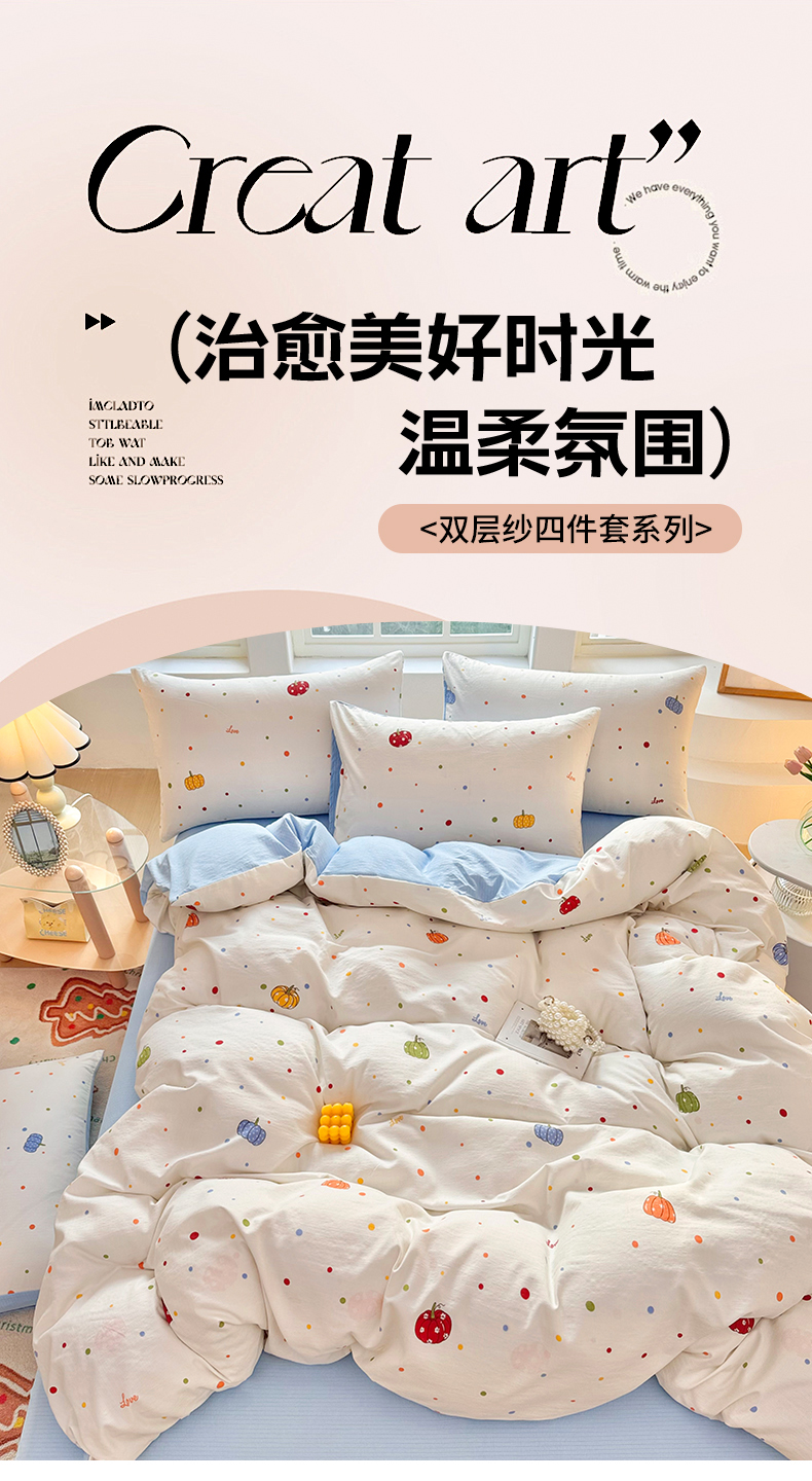 当前位置: 91家纺网 > 商品网购 > 床品套件 > 四件套 > 化纤普通四件套 > 悠米悠家 2026新款亲肤舒适木棉双层纱印花四件套 南瓜田园记