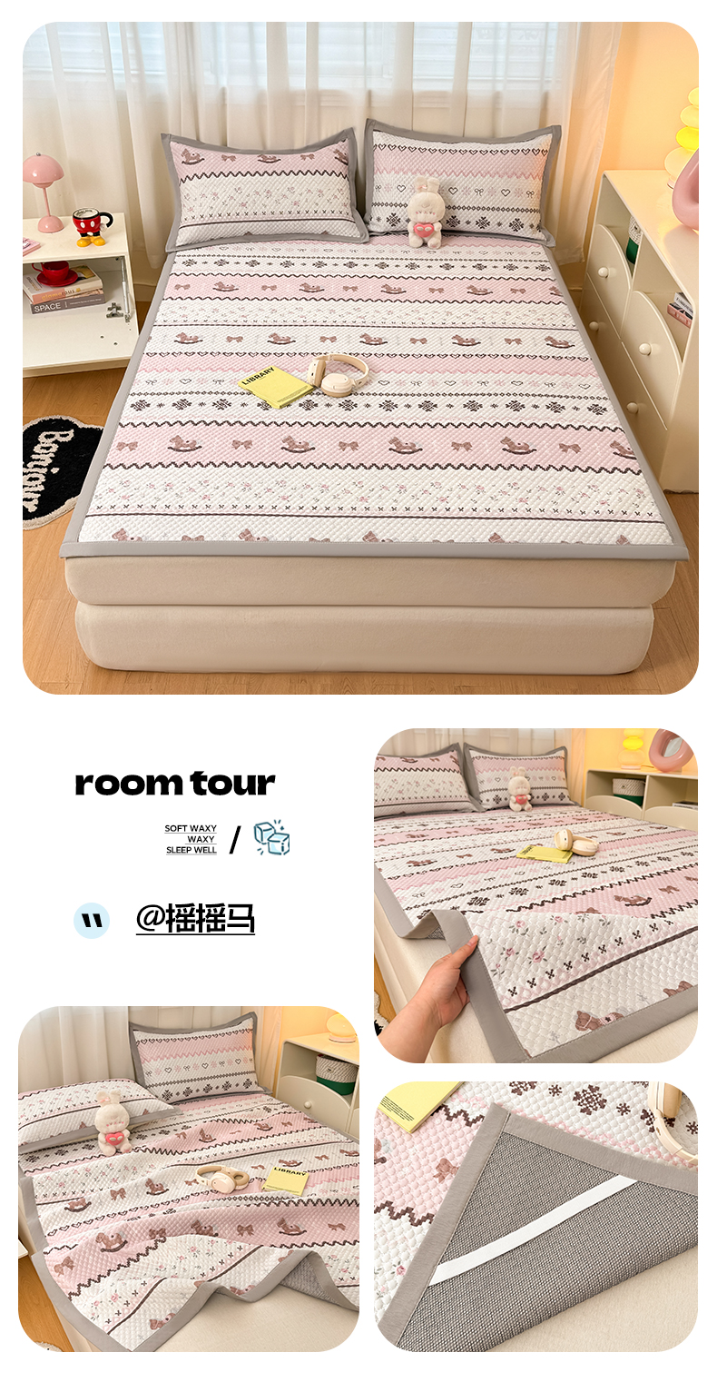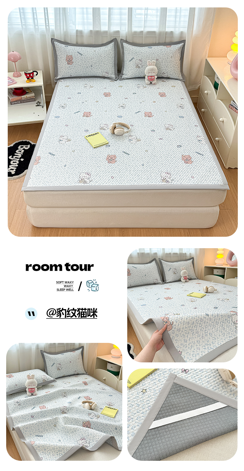 (总)大元 2026新款冰豆豆数码印花席三明治底凉席席子,花田兔影,豹纹猫咪,波点蝴蝶结,花知意,蓝色蝴蝶结,奶霜草莓,趣味小马,糖果小狗,线条小狗,星荣,摇摇马