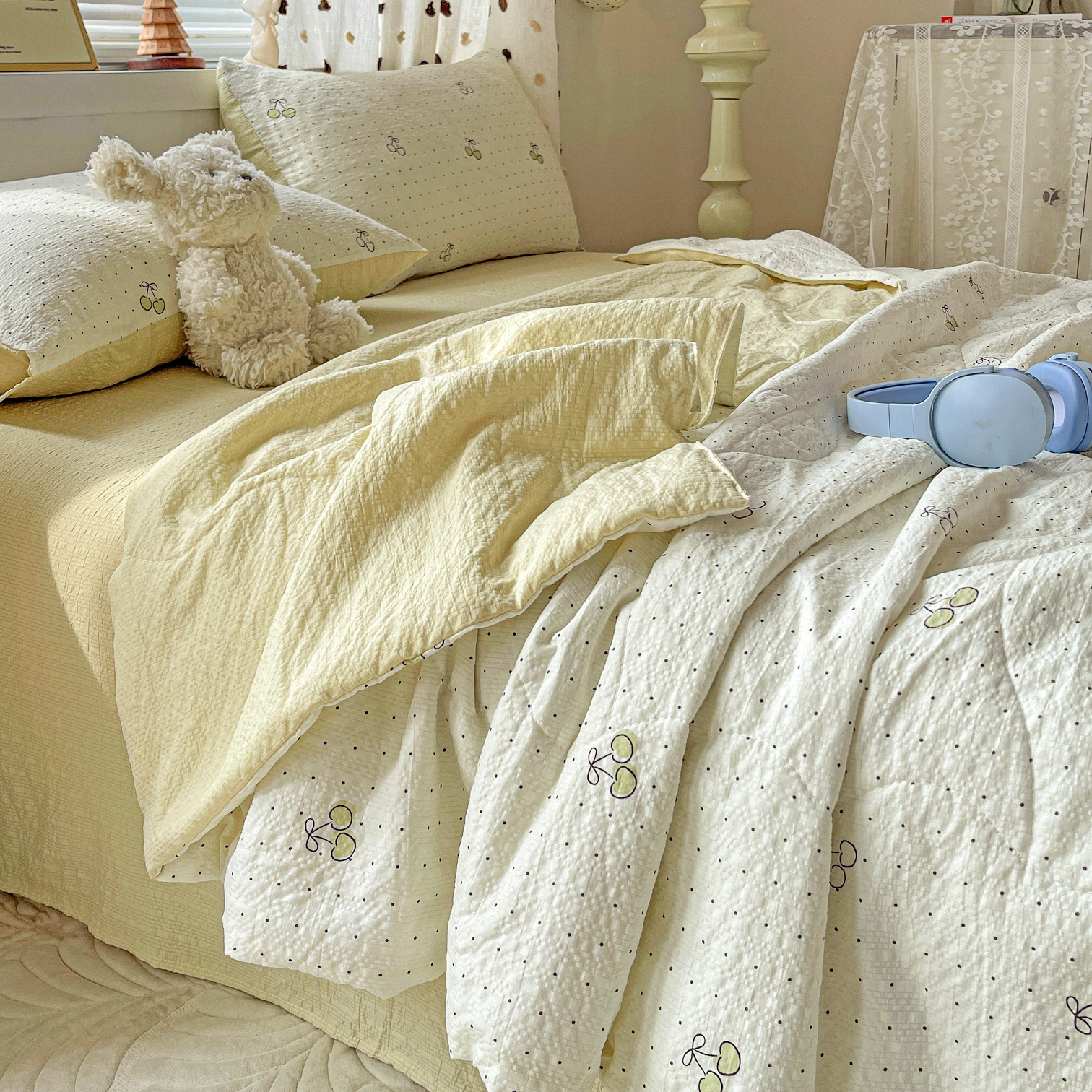 (总)一比一家纺 2026新款法式花边泡芙纱夏被四件套,春日小花,春日小兔,蛋糕熊,道格先生,费尔岛,红波点,红樱桃,蝴蝶谷,花枝兔,欢乐时光,浪漫满屋,马到成功,萌趣熊,梦宝贝 - 红,梦宝贝 - 黄,奶霜啵啵,南瓜象,青禾,甜心KT,晚安星人,小矮人,小红马,幸运汪,熊贝贝,悦己,紫花兔兔,青色樱桃,樱桃波点,甜樱喵,梦幻小马,甜心咖,柔诗意,青梅酱,黛蝶,云朵泡芙,萌趣熊咖,软萌南瓜