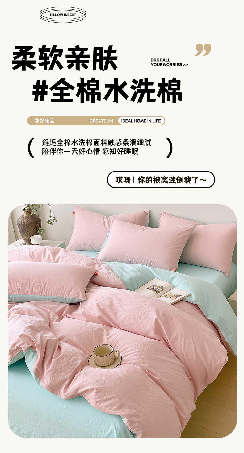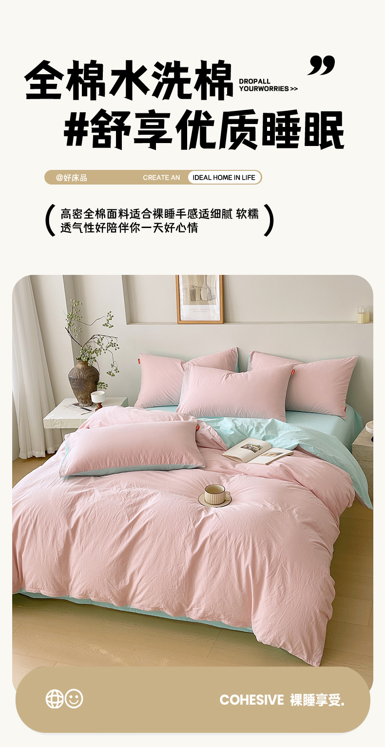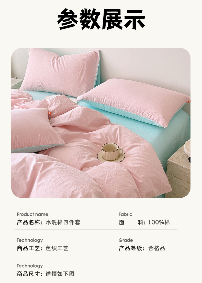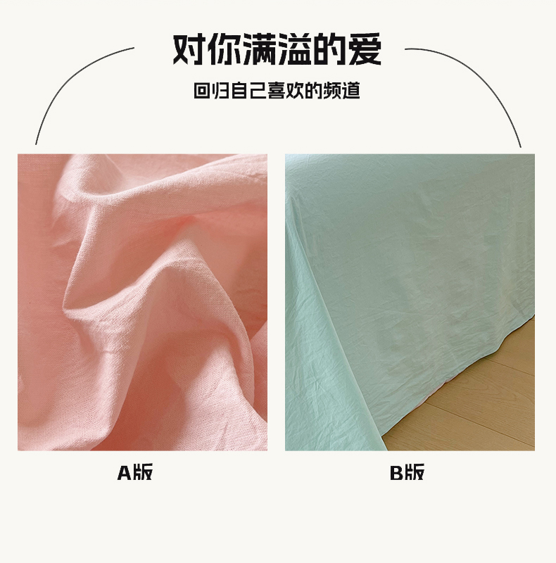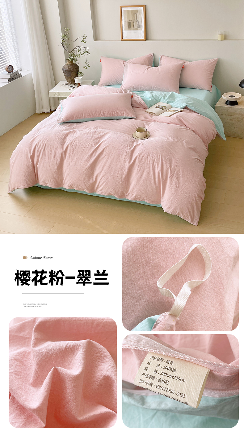 当前位置: 91家纺网 > 商品网购 > 床品套件 > 四件套 > 全棉普通四件套 > 春皖家纺 2026春夏新款双拼全棉纯棉水洗棉四件套 樱花粉-翠兰
