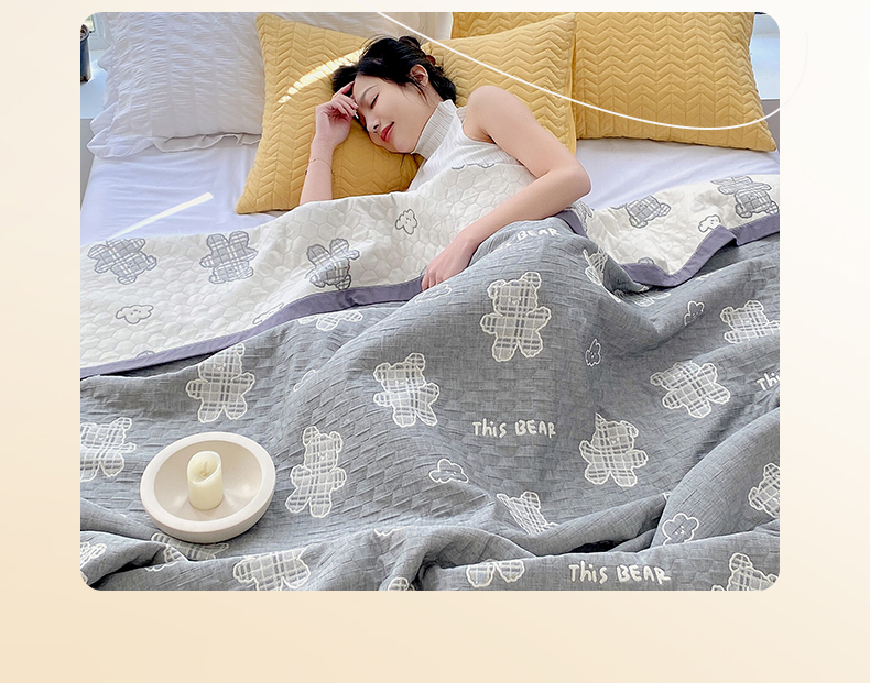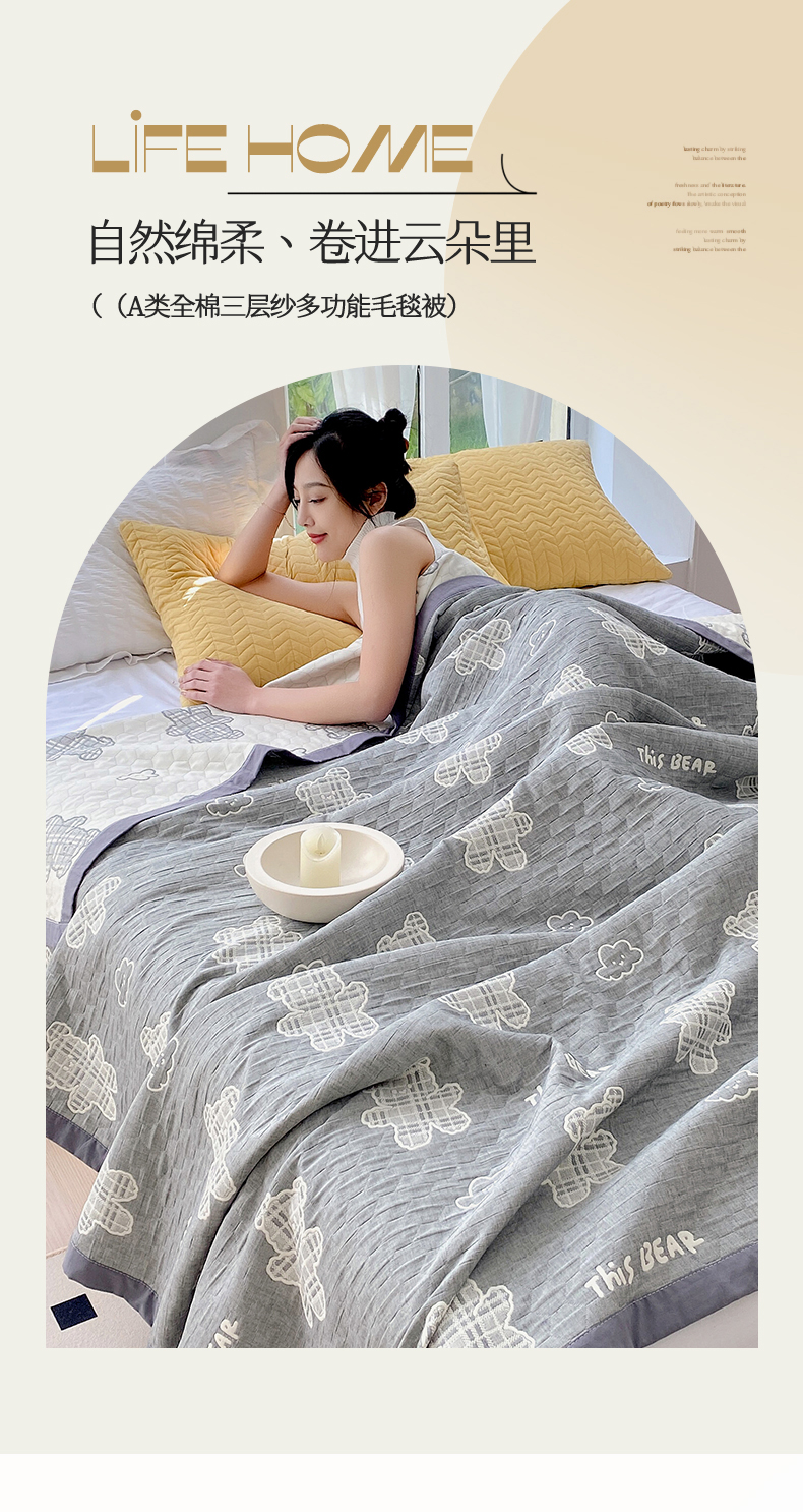 商品名称:兄弟坊 2026新款A类全棉三层纱多功能毛巾被夏被夏凉被(盖毯床单夏被) 云朵小熊-灰