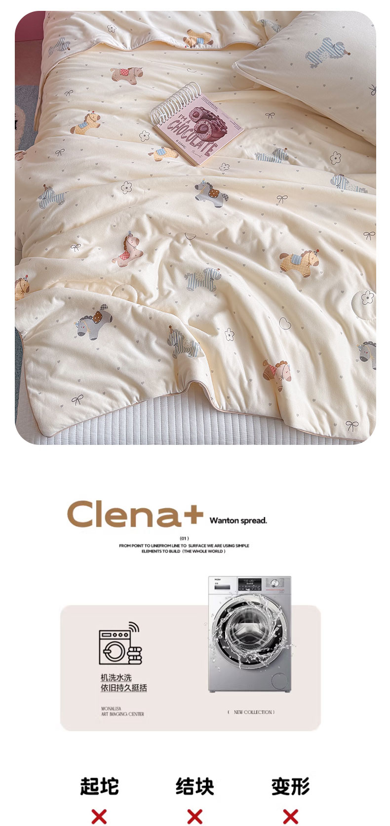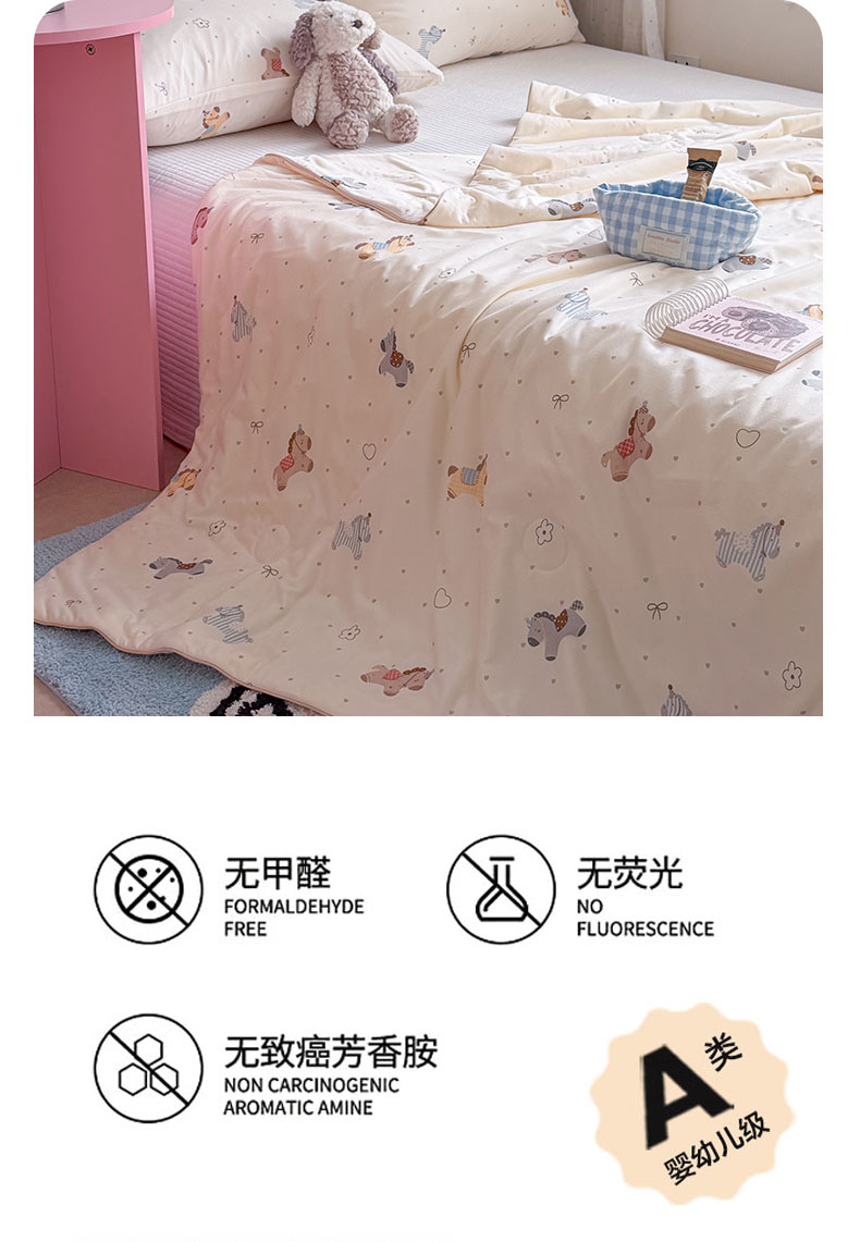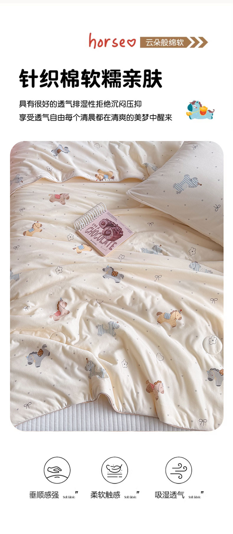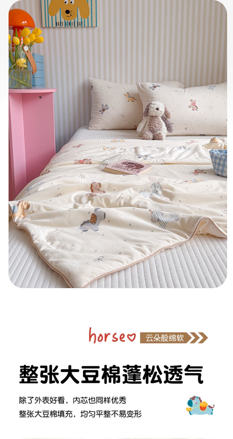 商品名称:桃子家居 2026新款A类卡通小清新奶乎乎高品质牛奶丝软糯针织棉嵌绳工艺夏被系列 针织嵌绳-森系小马