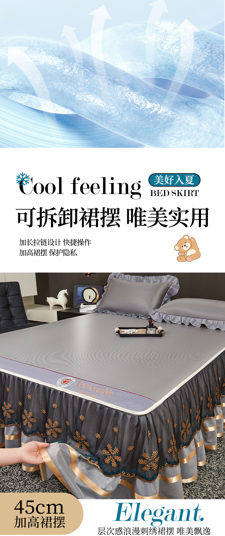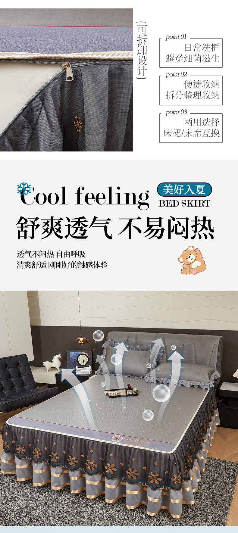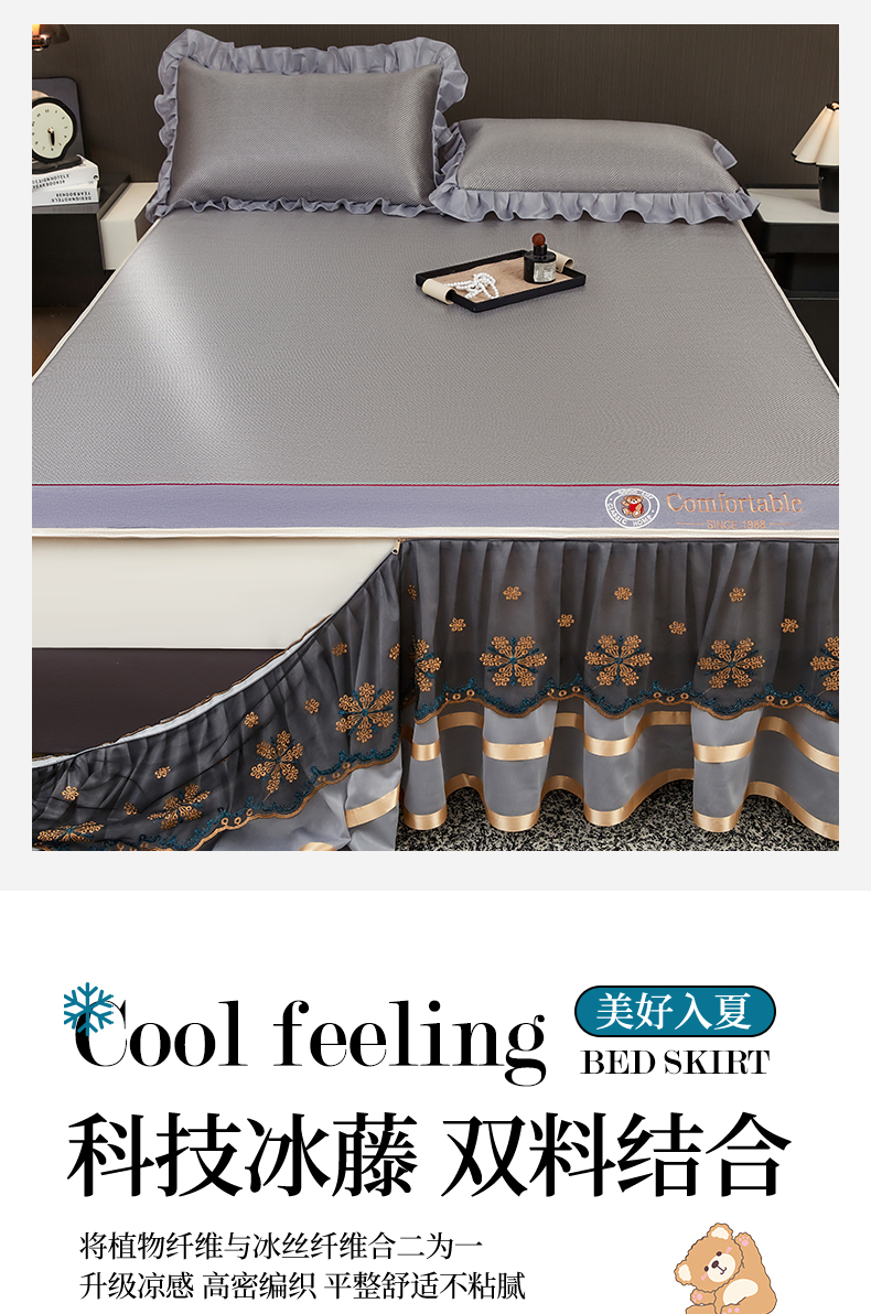 商品名称:情恒家纺 2026新款冰藤席可拆卸床裙款凉席席子凉席三件套-皇家 皇家-高级灰