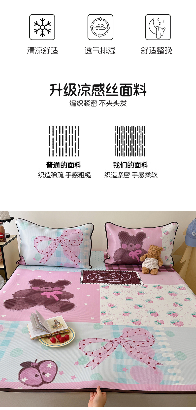 • 91家纺网 家纺一手货源 找家纺 山茶家居-原创设计(原山茶家纺) 2026新款韩国设计师合作款斜纹冰丝席凉席 韩国设计系列--草莓与熊