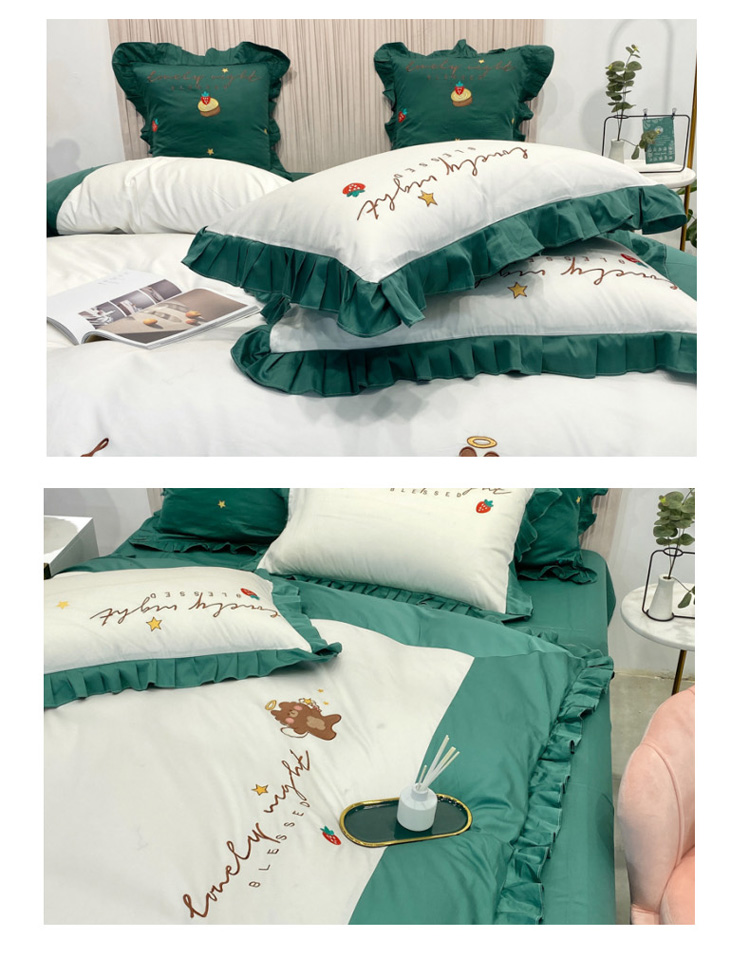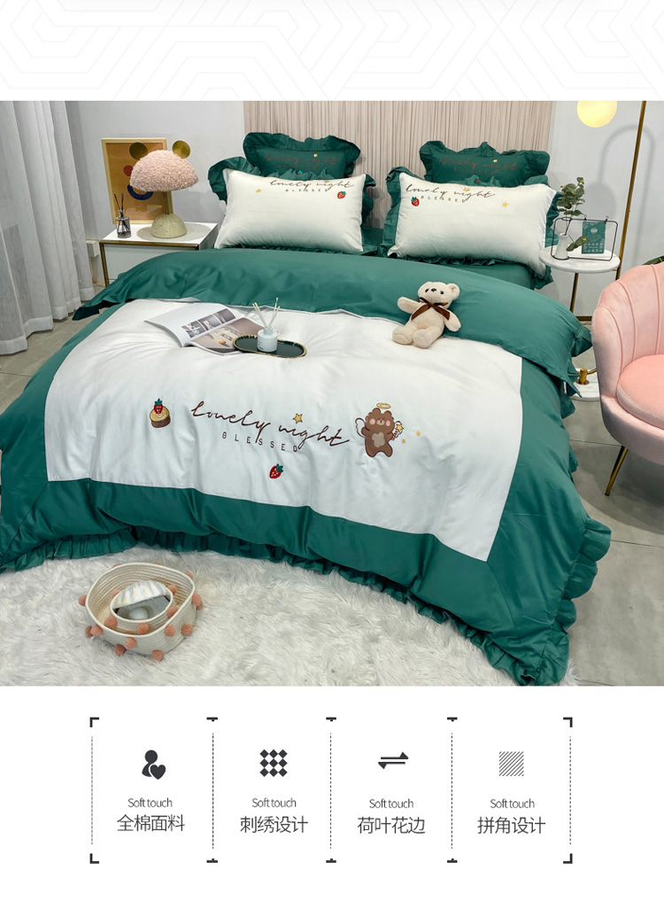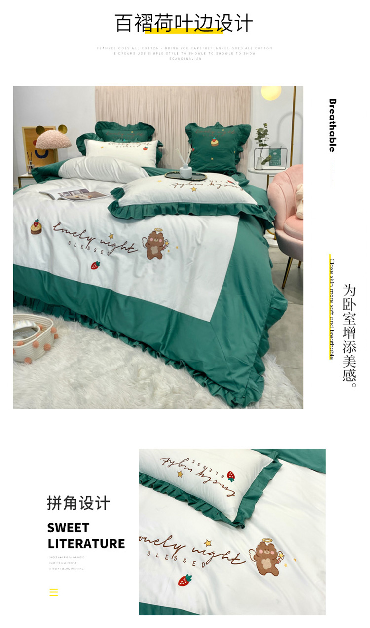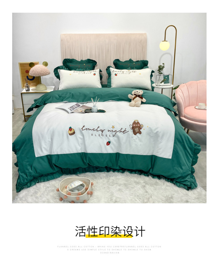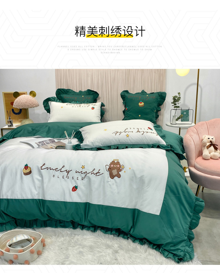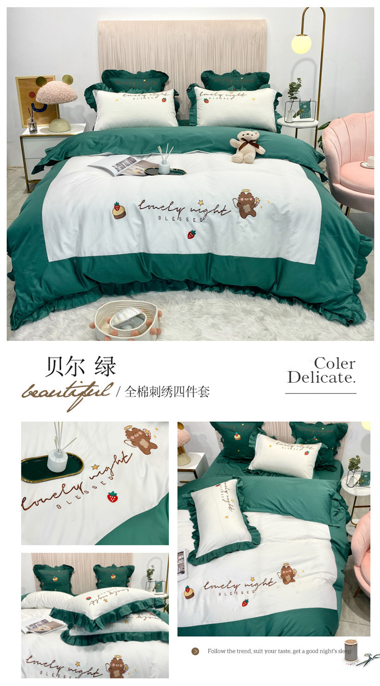 当前位置: 91家纺网 > 商品网购 > 床品套件 > 四件套 > 全棉活性四件套 > 眠帛家居 2020新款绣花全棉公主风四件套 贝尔-绿