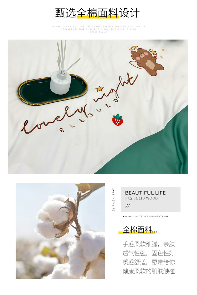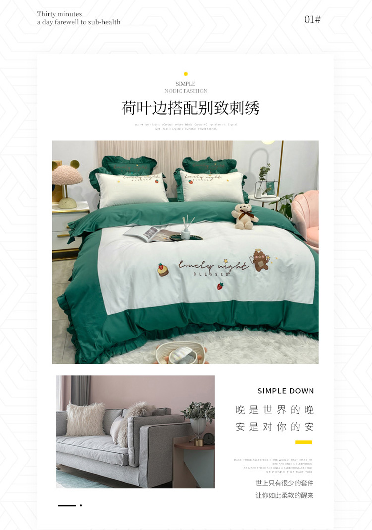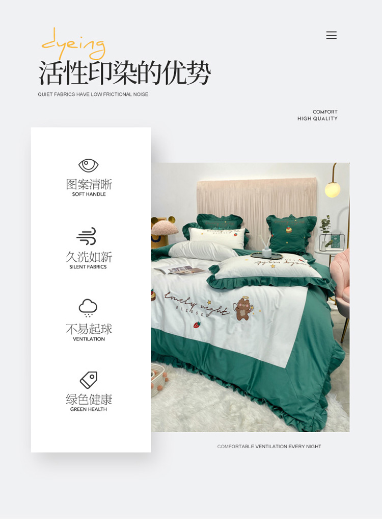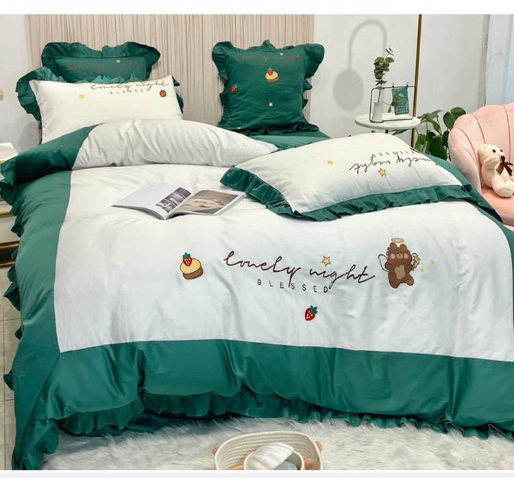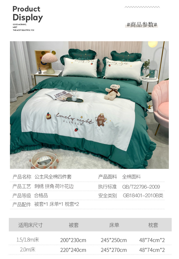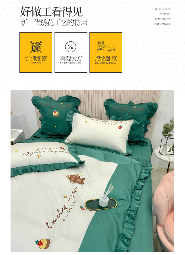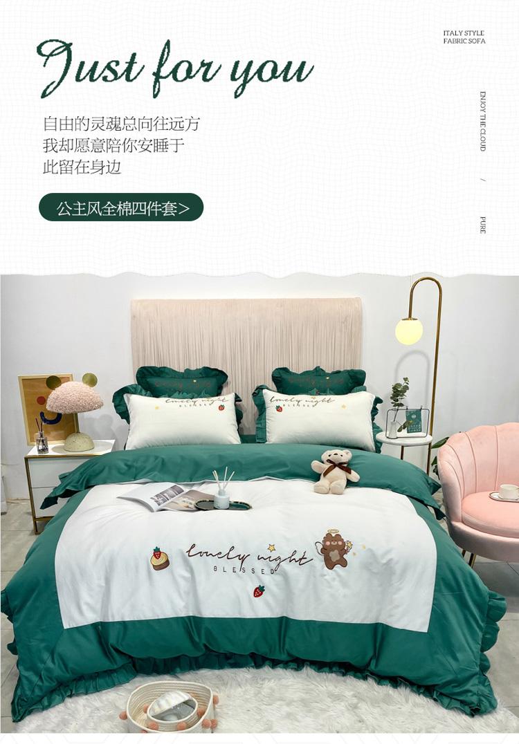 当前位置: 91家纺网 > 商品网购 > 床品套件 > 四件套 > 全棉活性四件套 > 眠帛家居 2020新款绣花全棉公主风四件套 贝尔-绿