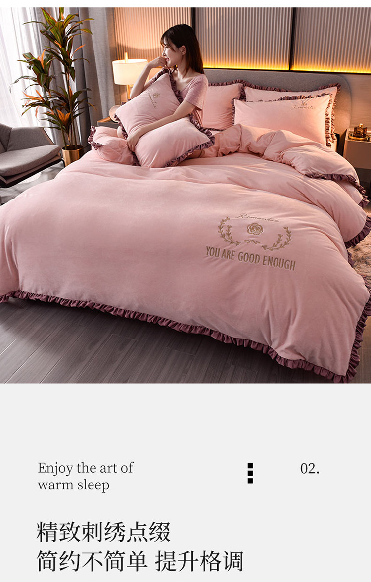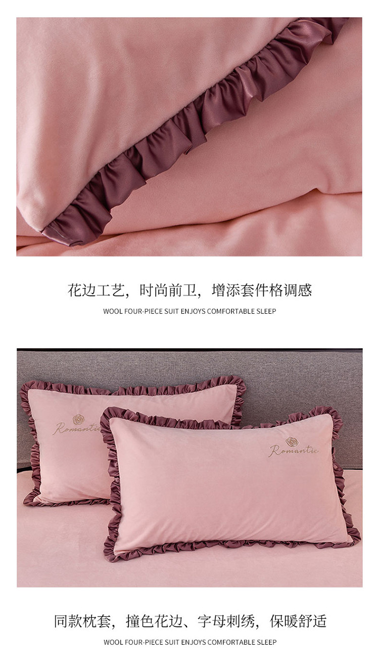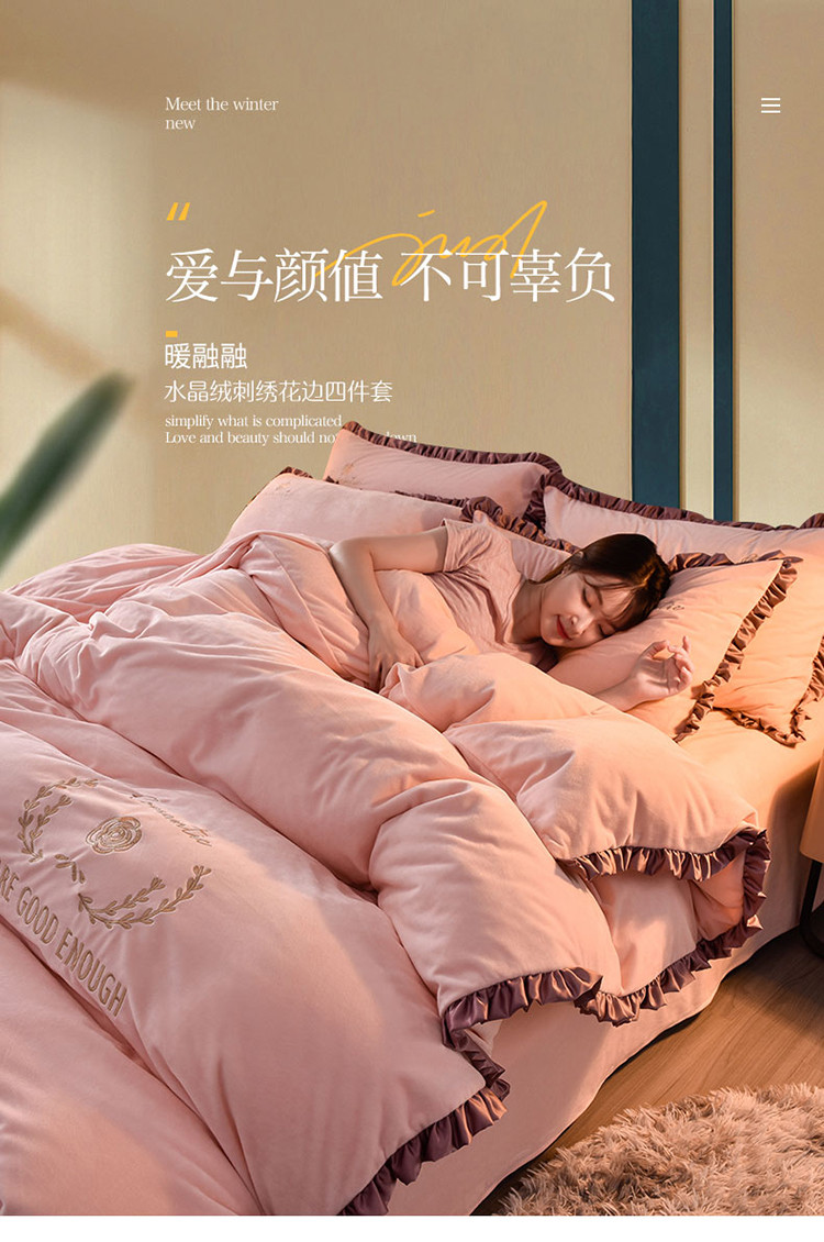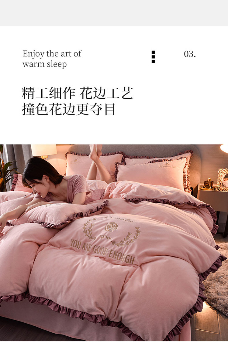米奈2020款朵拉高克重水晶绒木耳边系列四件套 粉色+紫边