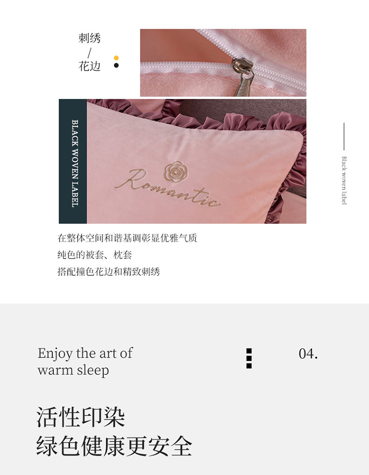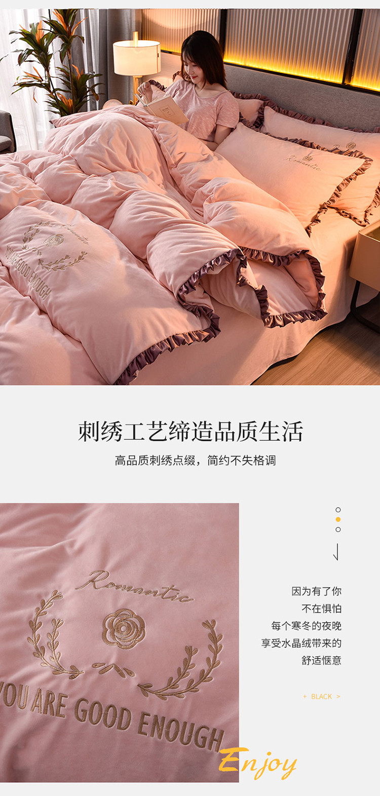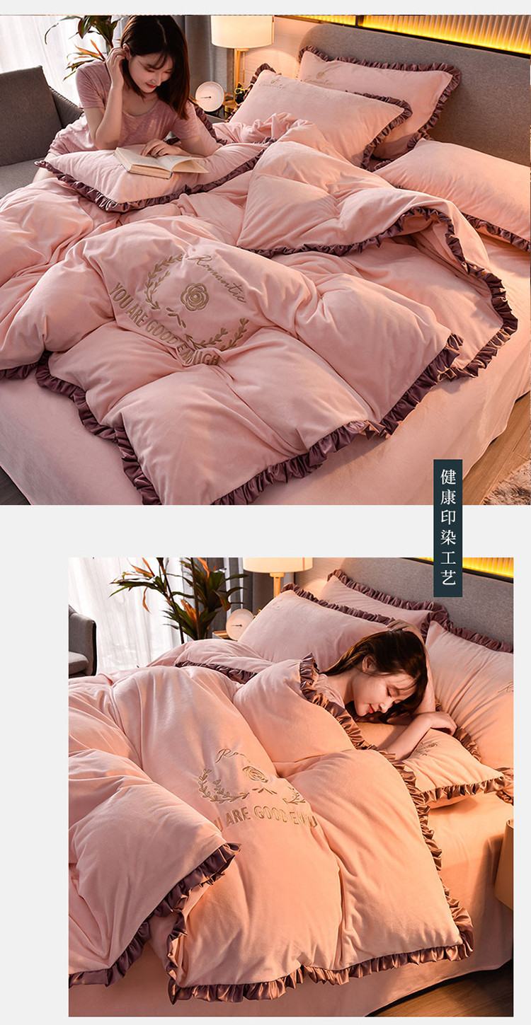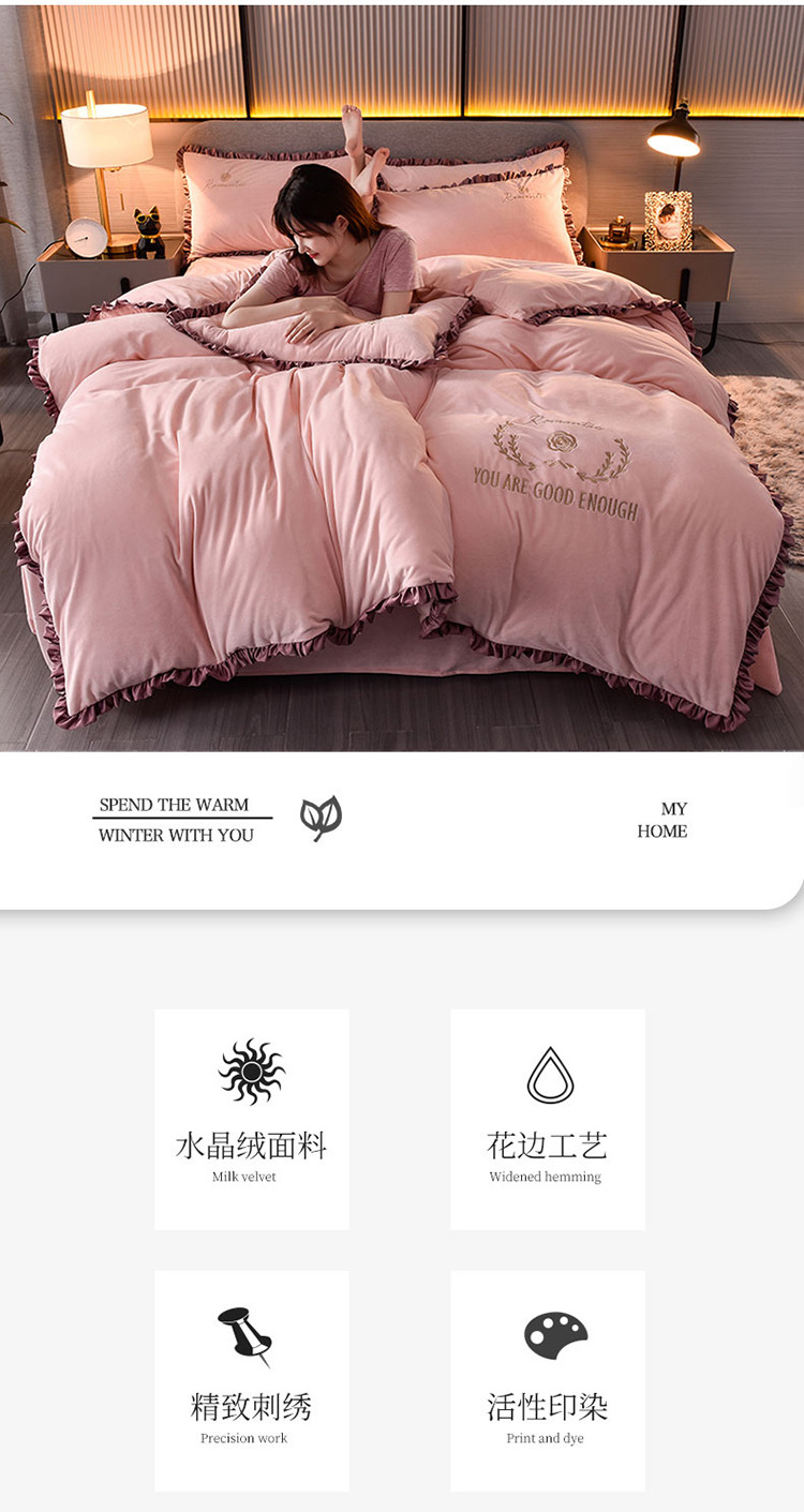 米奈2020款朵拉高克重水晶绒木耳边系列四件套 粉色+紫边