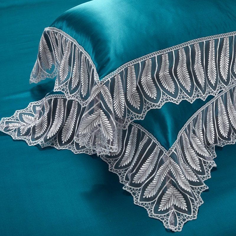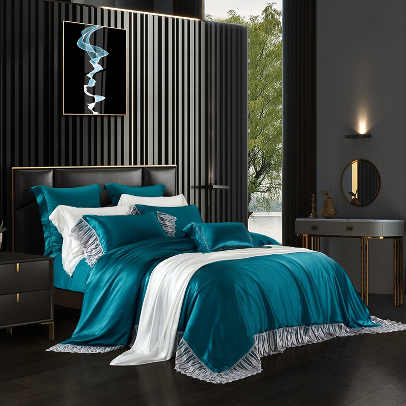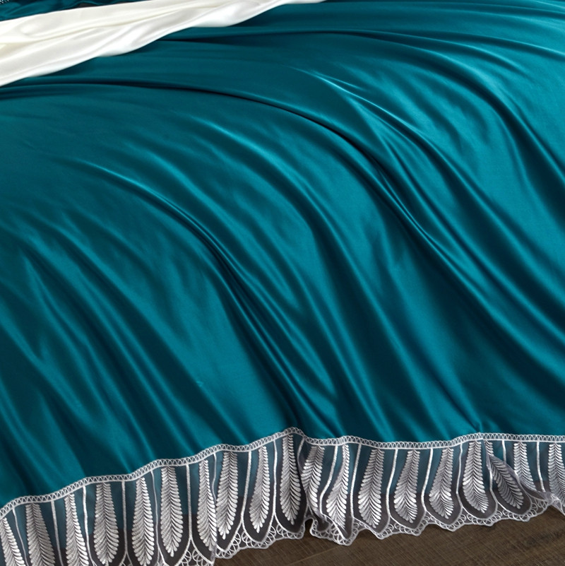 雅韵诗真丝馆 2023新款素色真丝四件套 蕾丝孔雀蓝