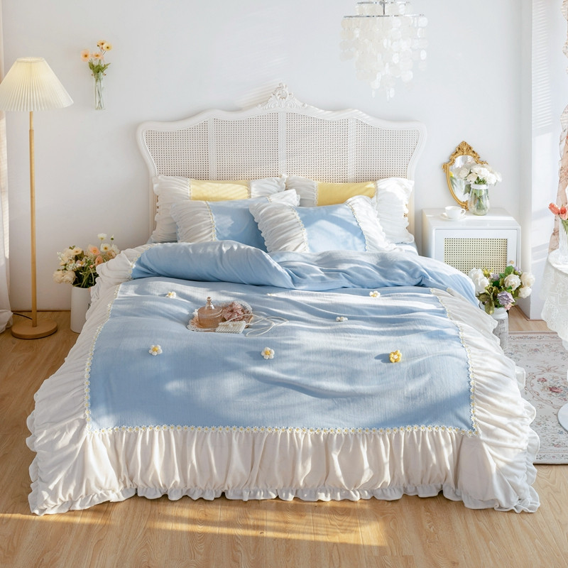 (总)漫调家纺 2025新款全棉ins风蝴蝶结韩系奶油花边床盖三件套,奶油白,奶油粉,奶油杏