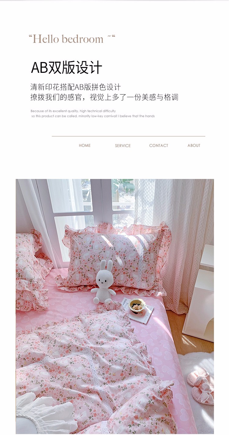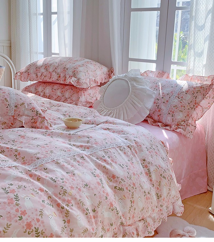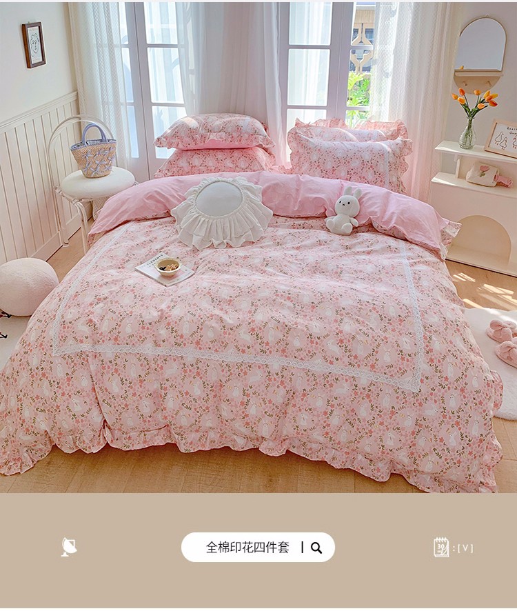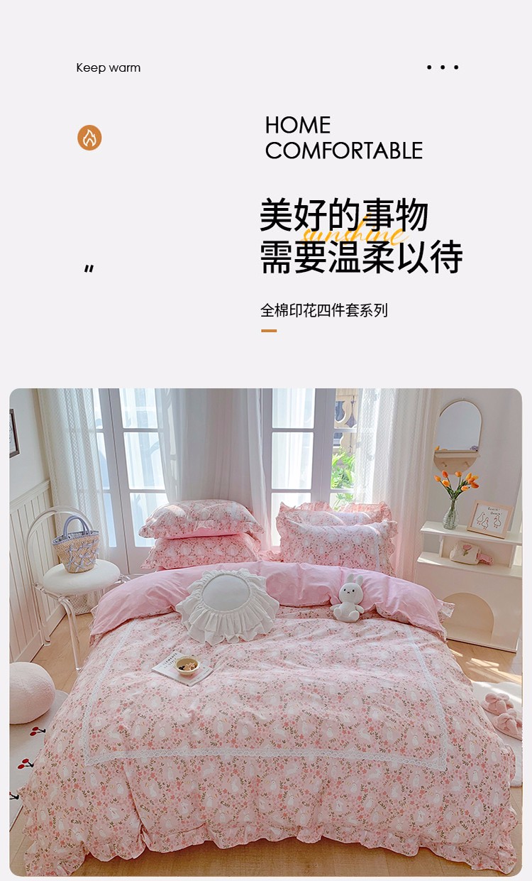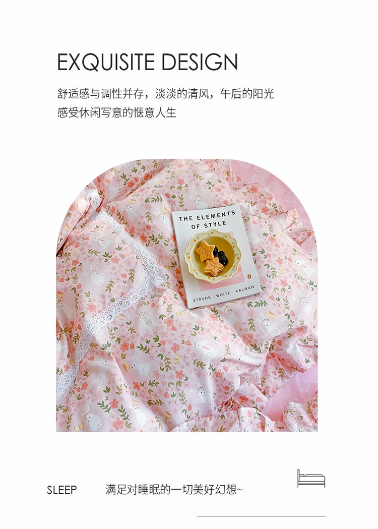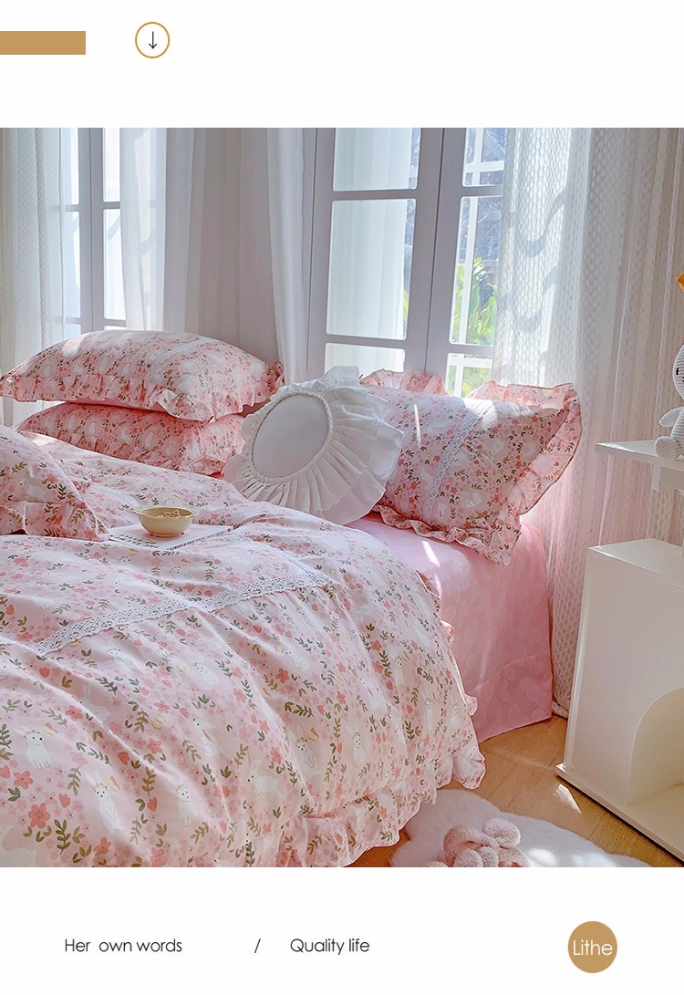 眠屿 2022新款全棉小碎花法式花边四件套 花间兔