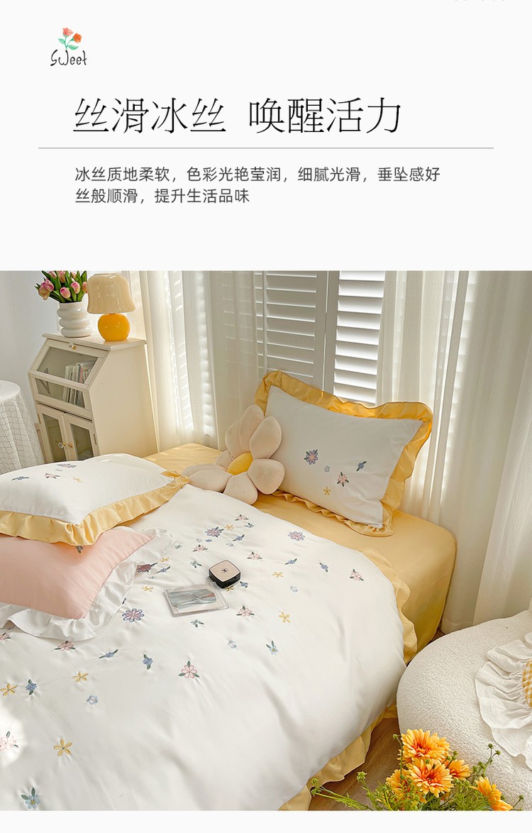 优悦 2022新款冰丝绣花四件套浅汐-花香粉