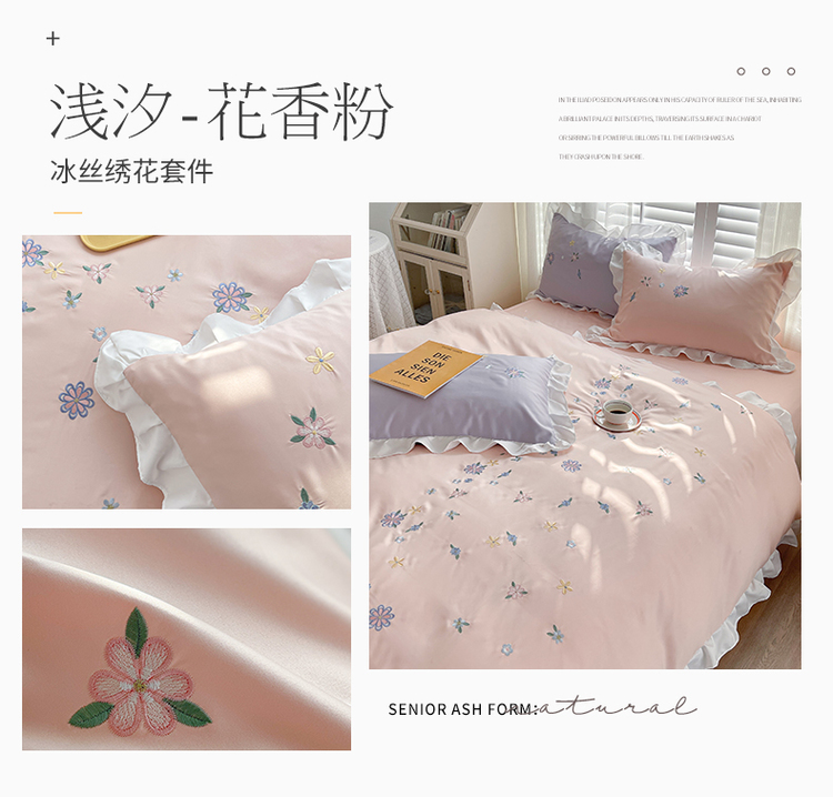 商品名称:优悦 2022新款冰丝绣花四件套浅汐-花香粉
