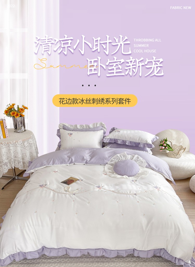 商品名称:优悦 2022新款花边款冰丝刺绣四件套 花悦白+紫