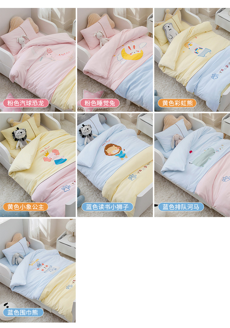 (总)喜多兔儿童家纺 2025新款小美好13372纯棉绣花幼儿园被子三件套多件套,组合图仅供展示,粉色美好小猫咪,粉色美好小兔子,黄色美好卡皮巴拉,黄色美好小狮子,蓝色美好独角兽,蓝色美好小熊,绿色美好小恐龙,绿色美好小青蛙