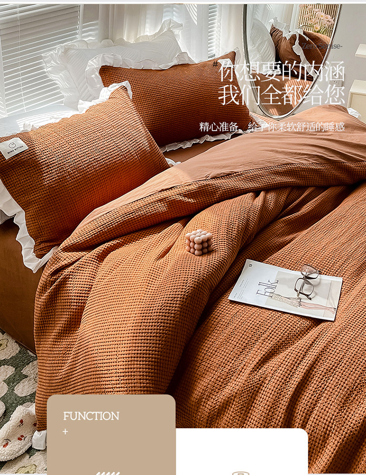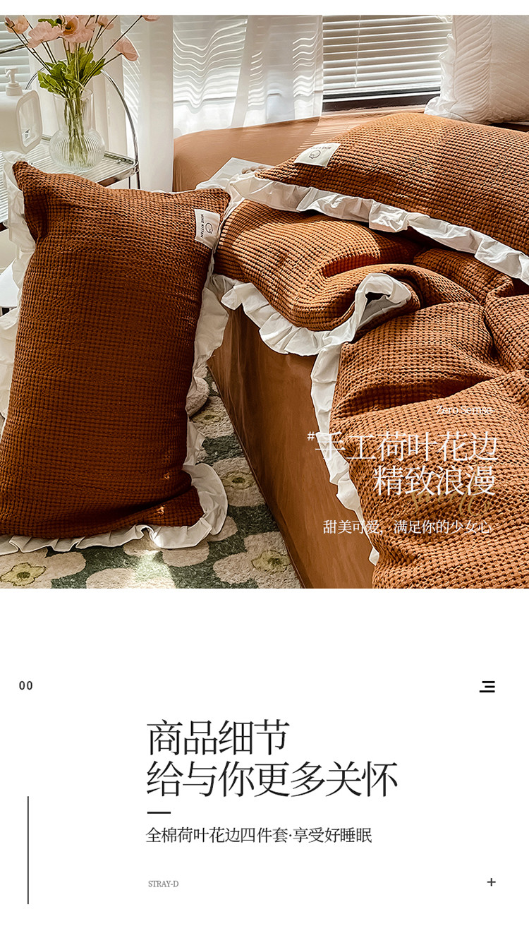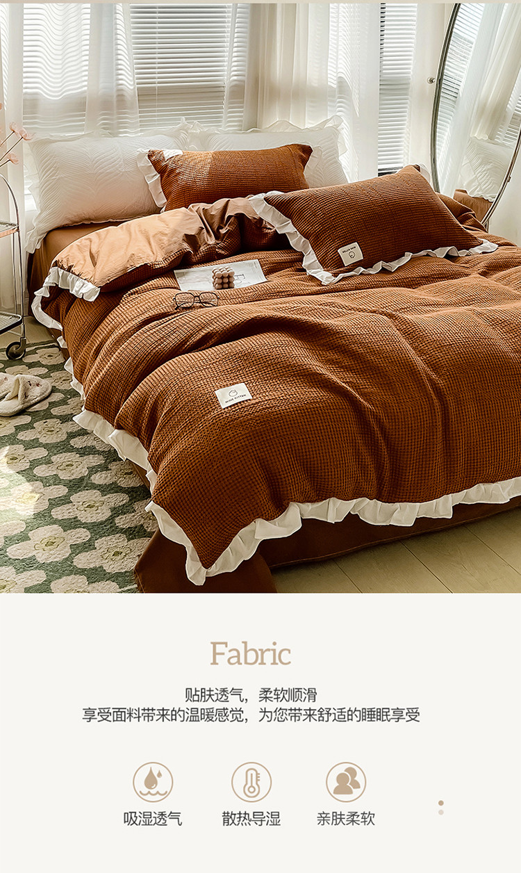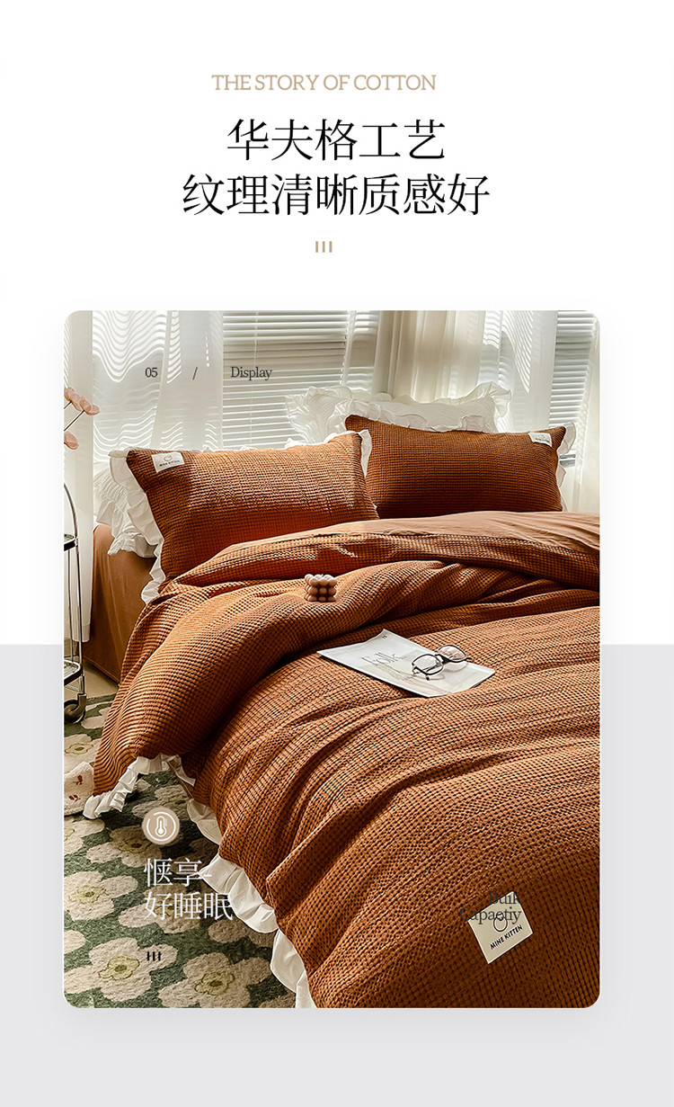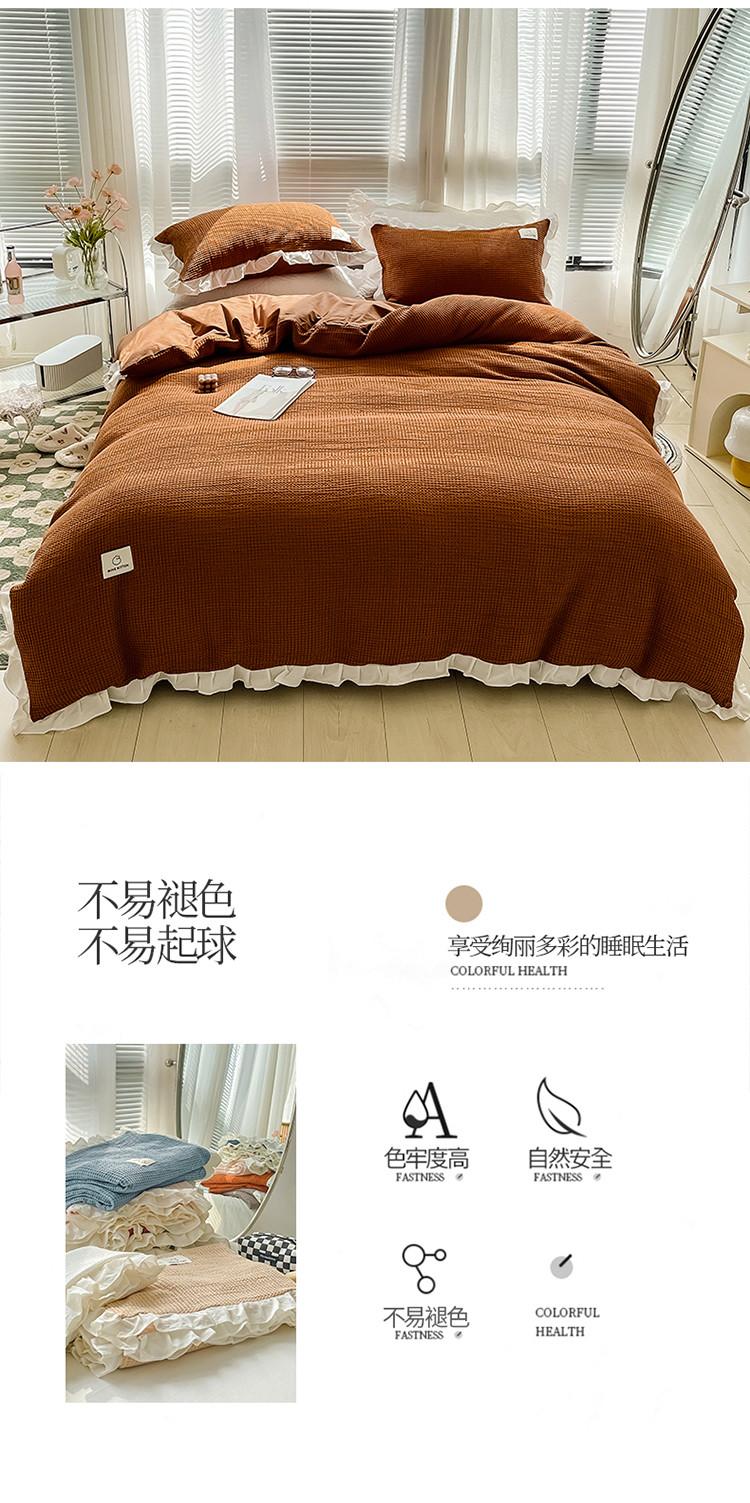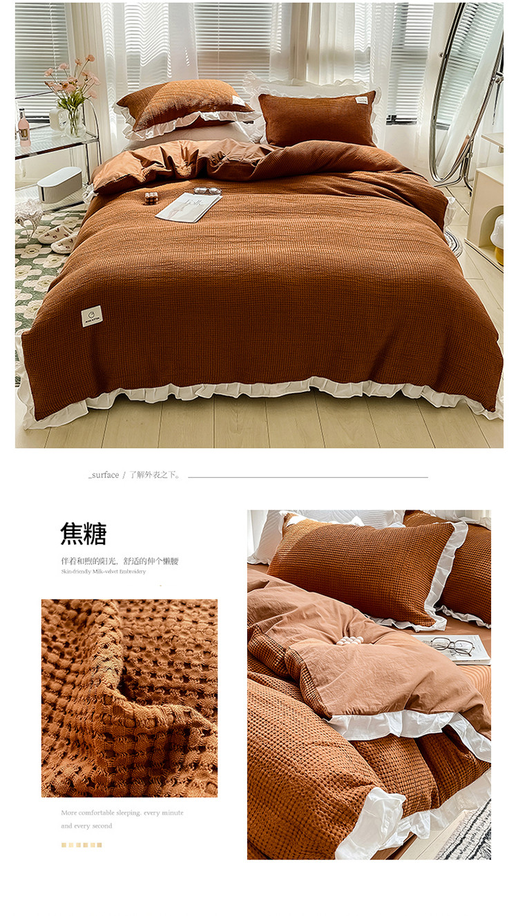 雅萱 2022新款全棉华夫格水洗棉四件套花边款 焦糖