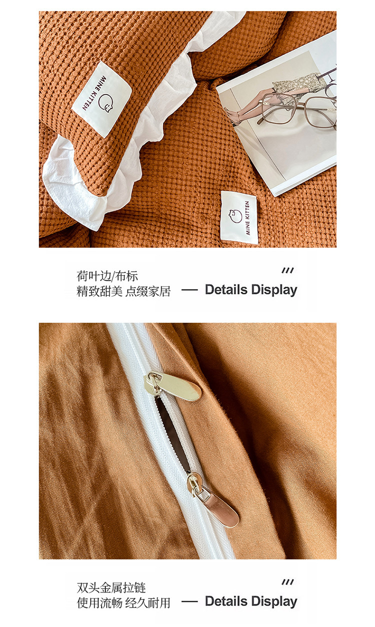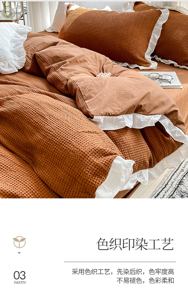 商品名称:雅萱 2022新款全棉华夫格水洗棉四件套花边款 焦糖