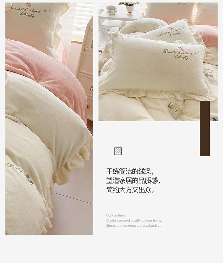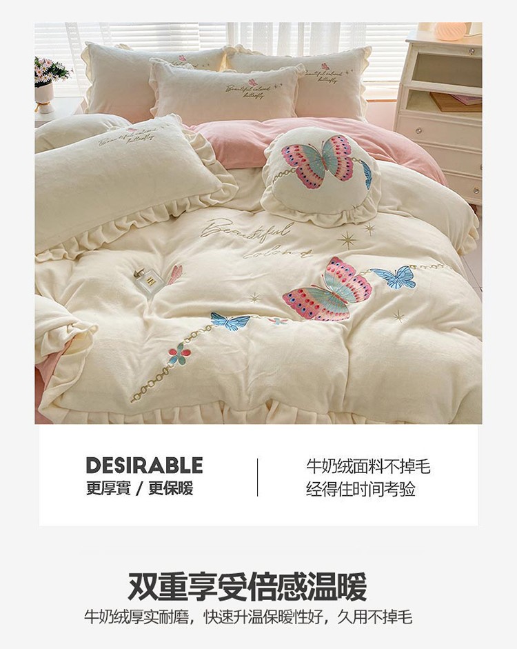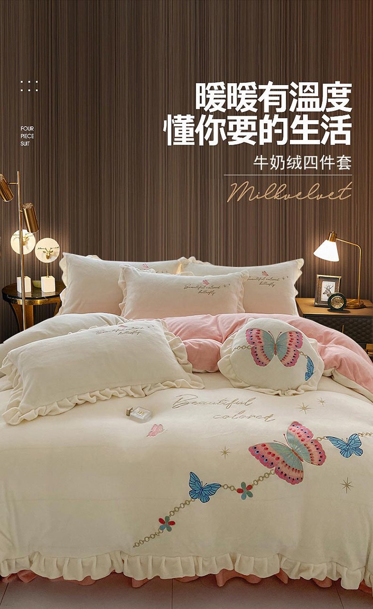 铠畅直播供货轻奢韩版花边高克重牛奶绒刺绣四件套床裙款蝶恋白