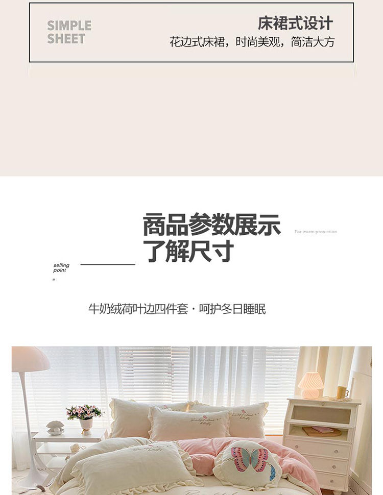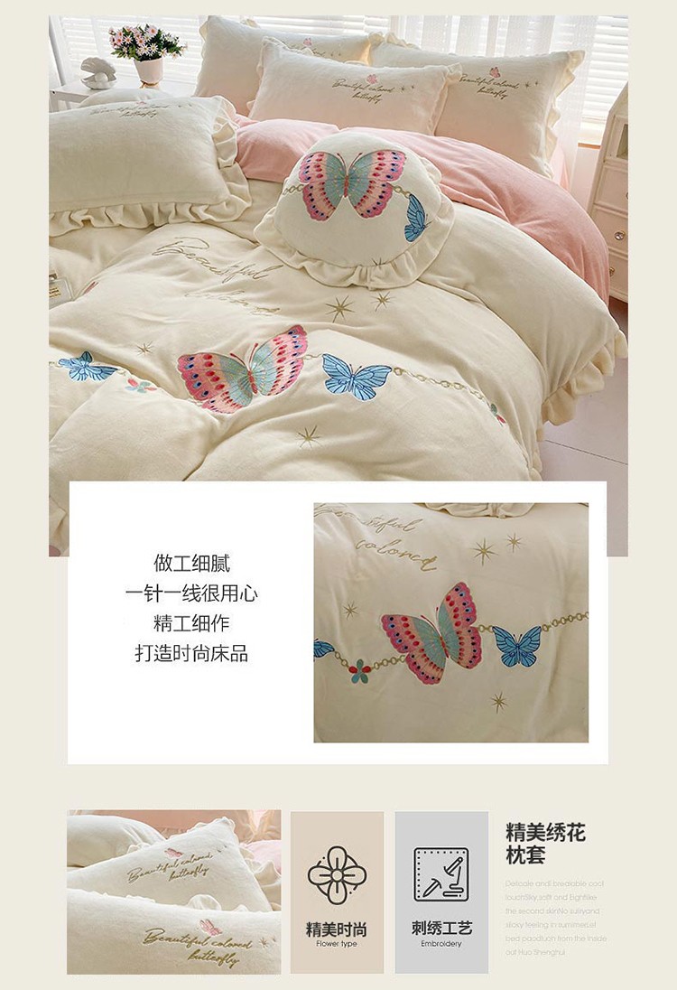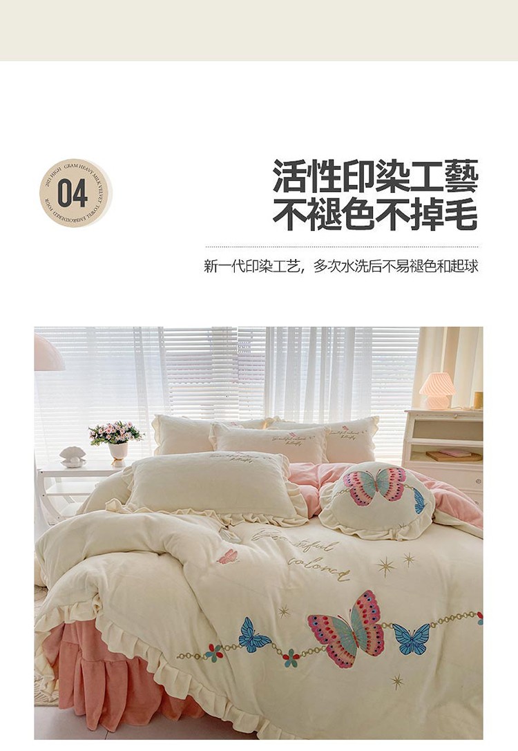 商品名称:铠畅直播供货轻奢韩版花边高克重牛奶绒刺绣四件套床裙款蝶恋白