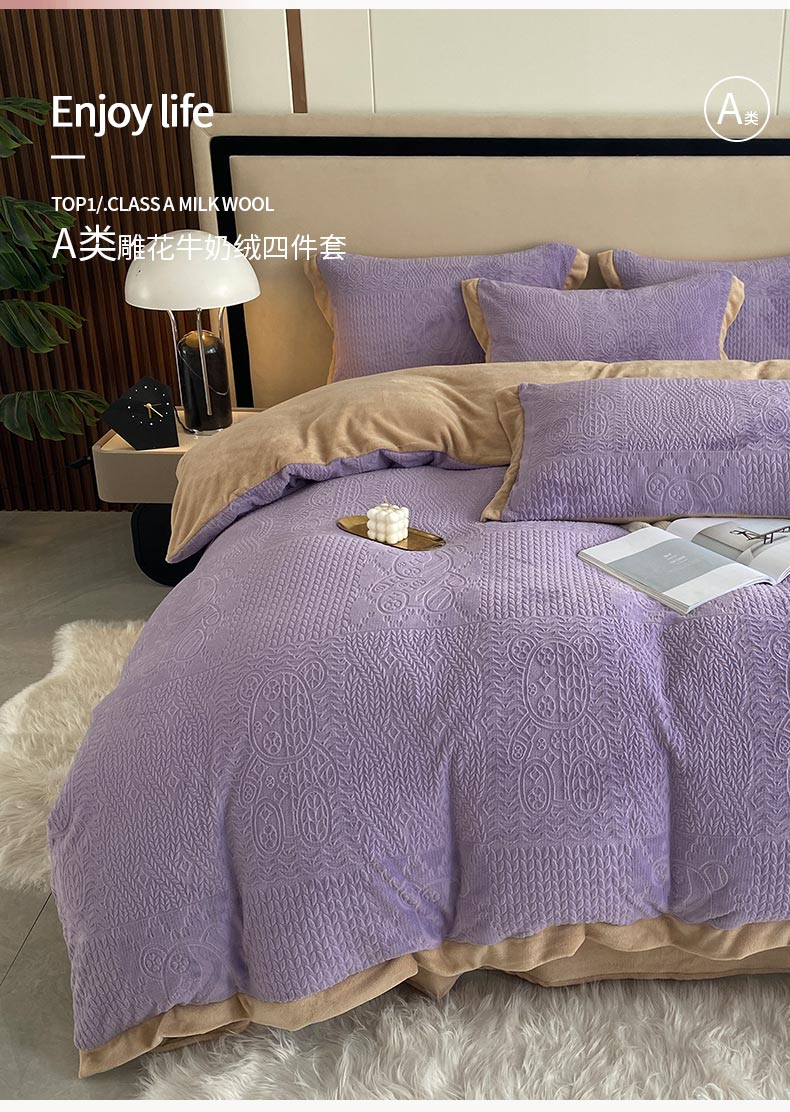 商品名称:铠畅 2022新款230克轻奢简约烂花绒牛奶绒剪花四件套 魅力熊-紫