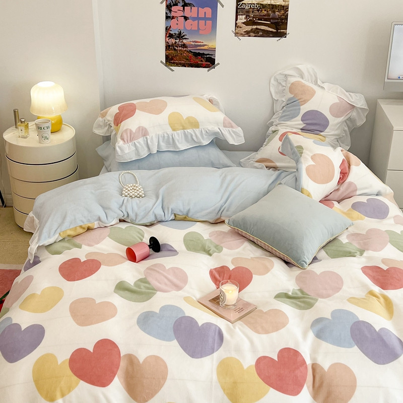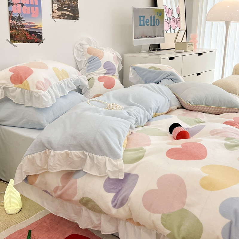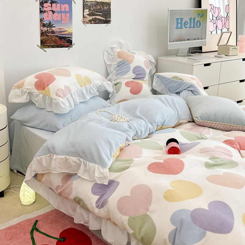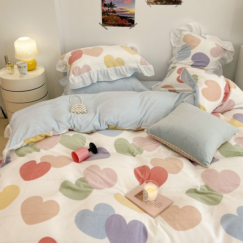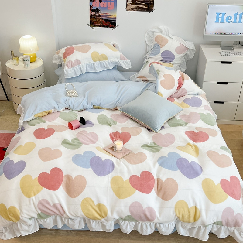 昔可 2022新款花边牛奶绒四件套 七彩爱心