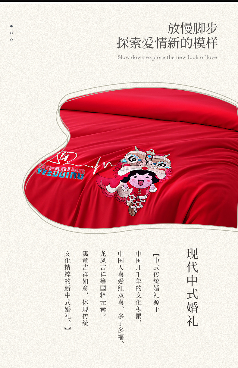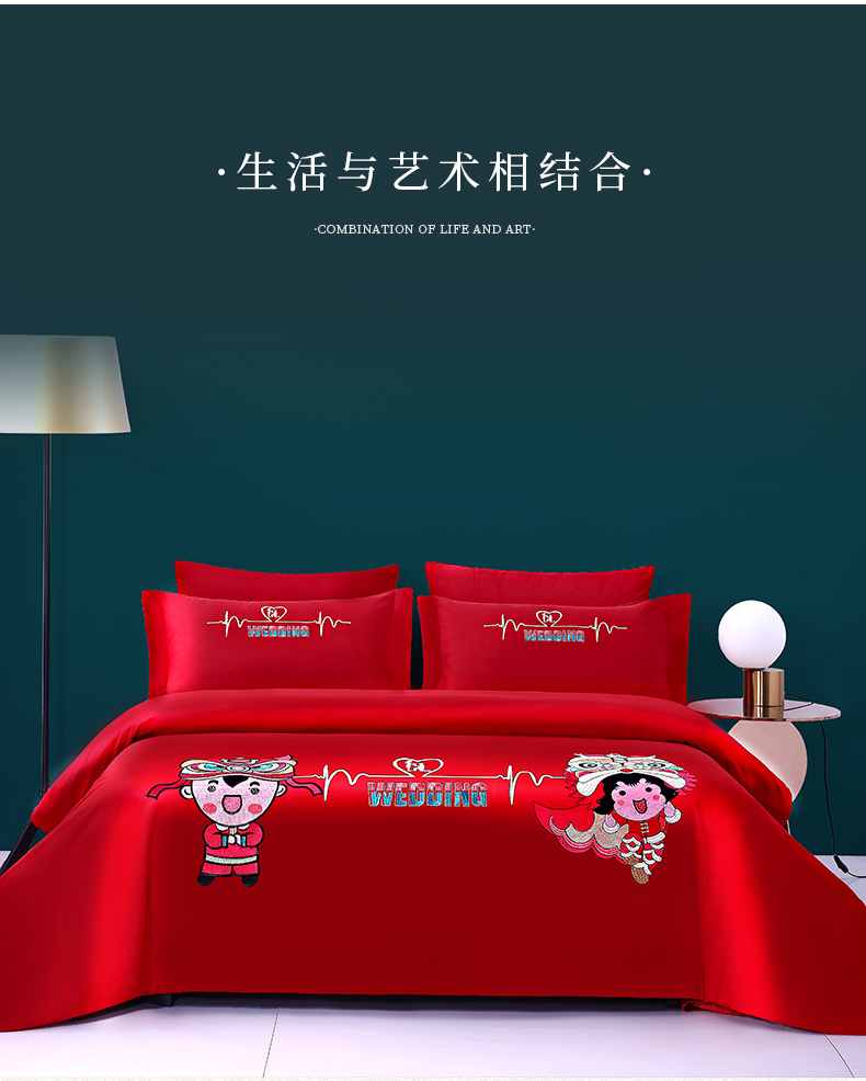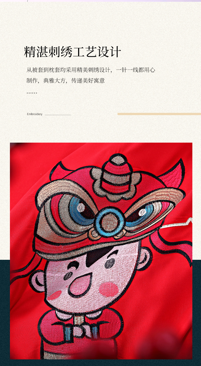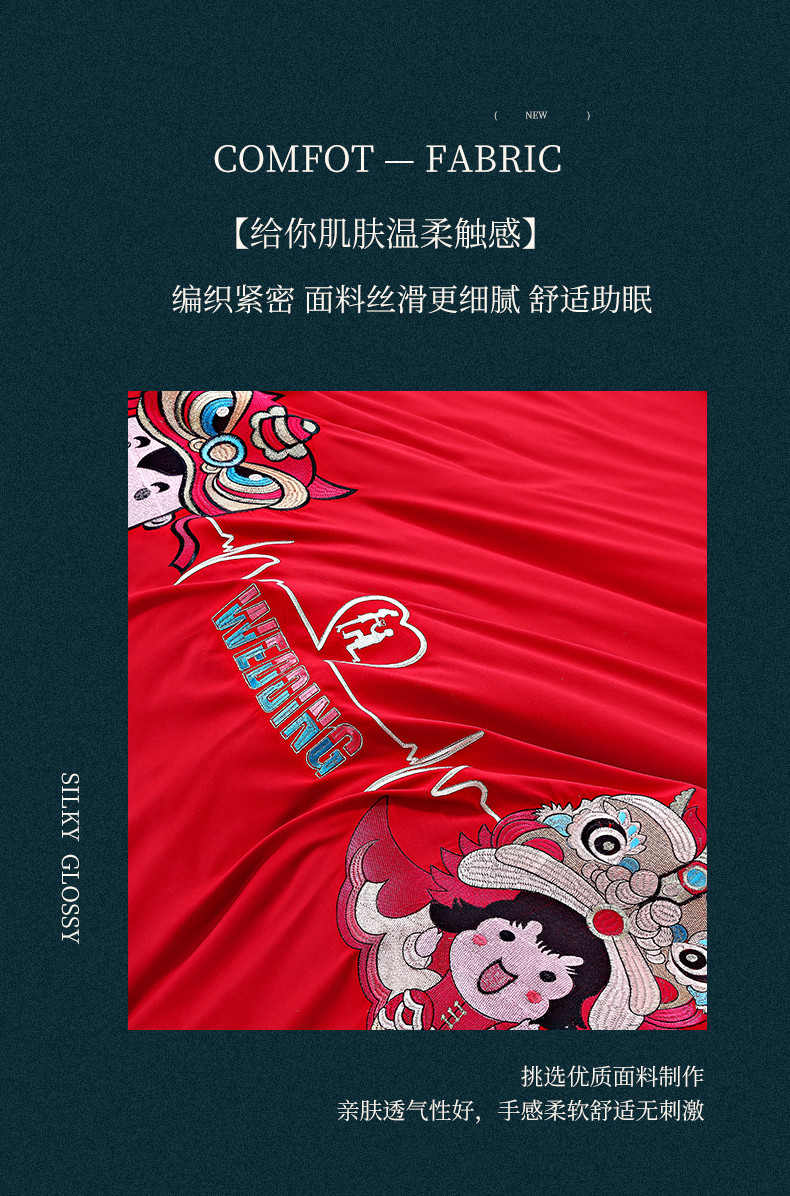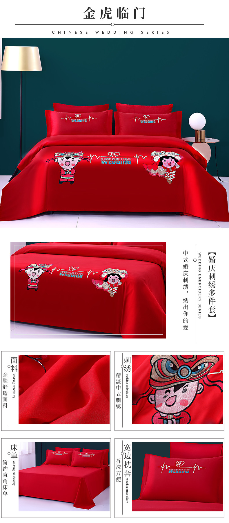 当前位置: 91家纺网 > 商品网购 > 床品套件 > 四件套 > 全棉普通四件套 > 2025新款亲肤棉绣花刺绣婚庆四件套 萌狮报喜