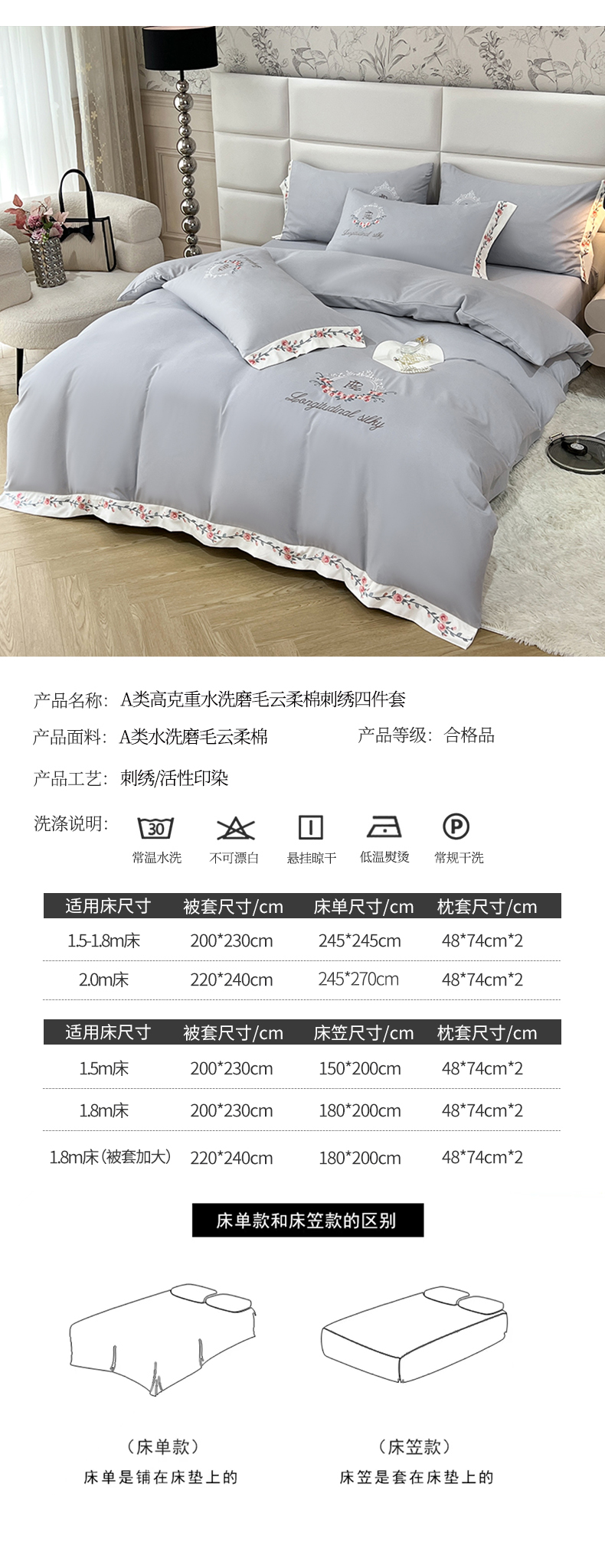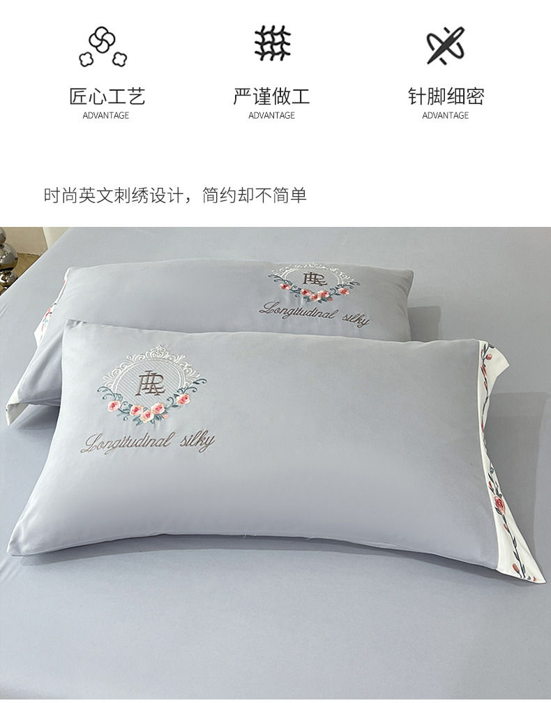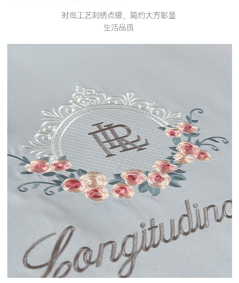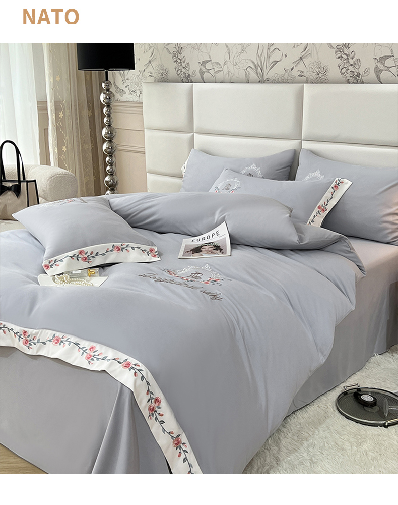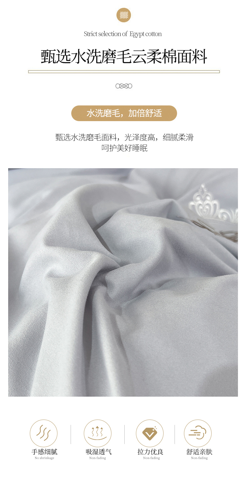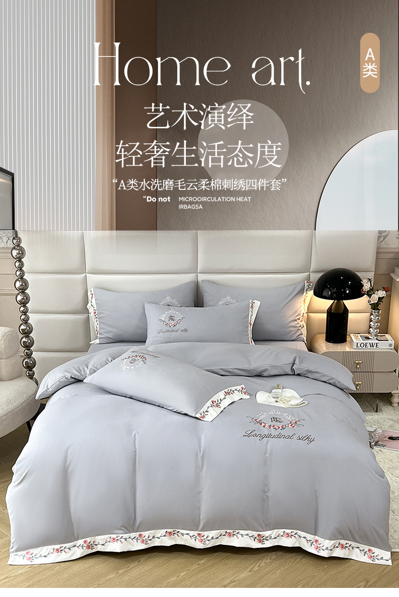 商品名称:易辰美 2024新款A类高克重水洗磨毛云柔棉刺绣四件套 绅士灰