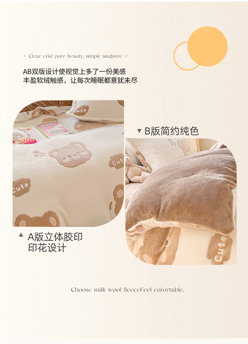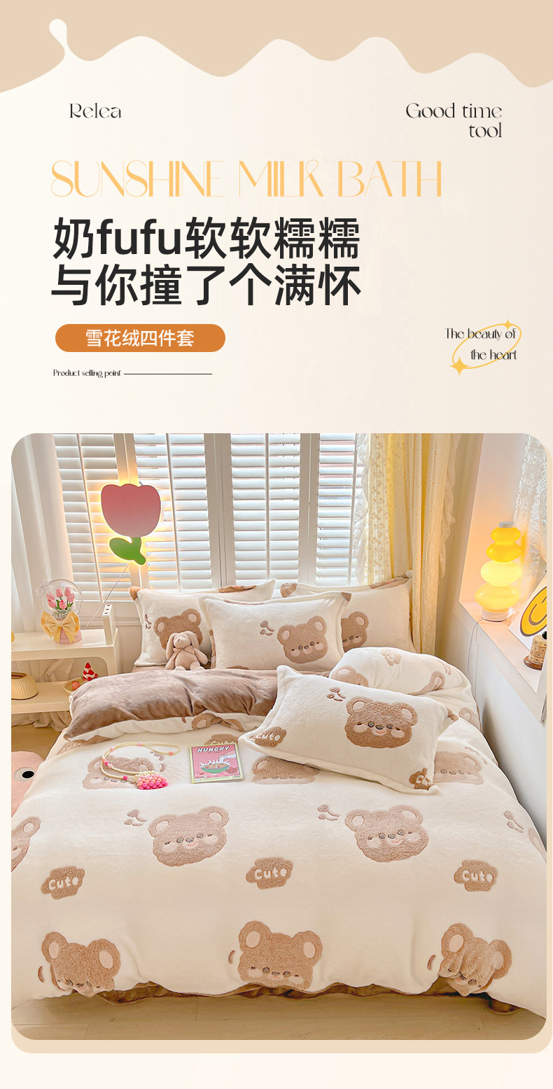 当前位置: 91家纺网 > 商品网购 > 床品套件 > 四件套 > 磨绒四件套 > 川悦生活 2023新款立体雪花绒四件套 可爱熊仔