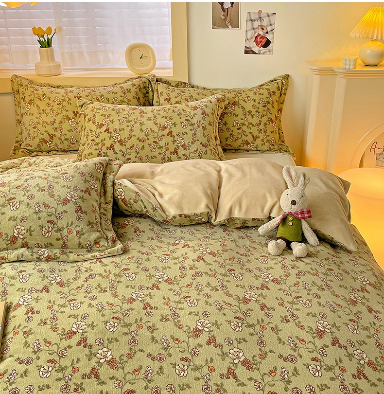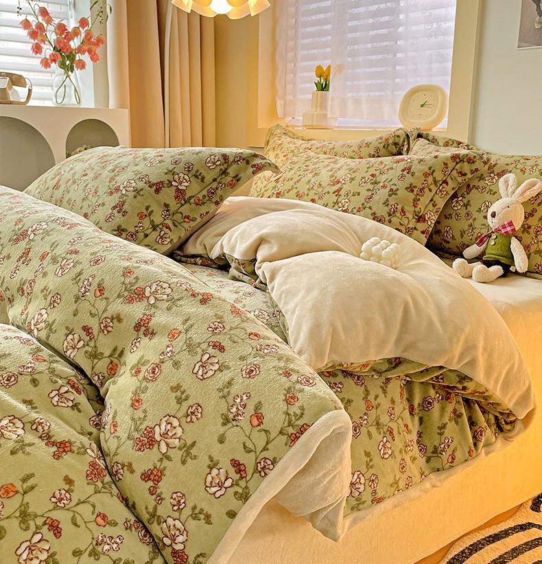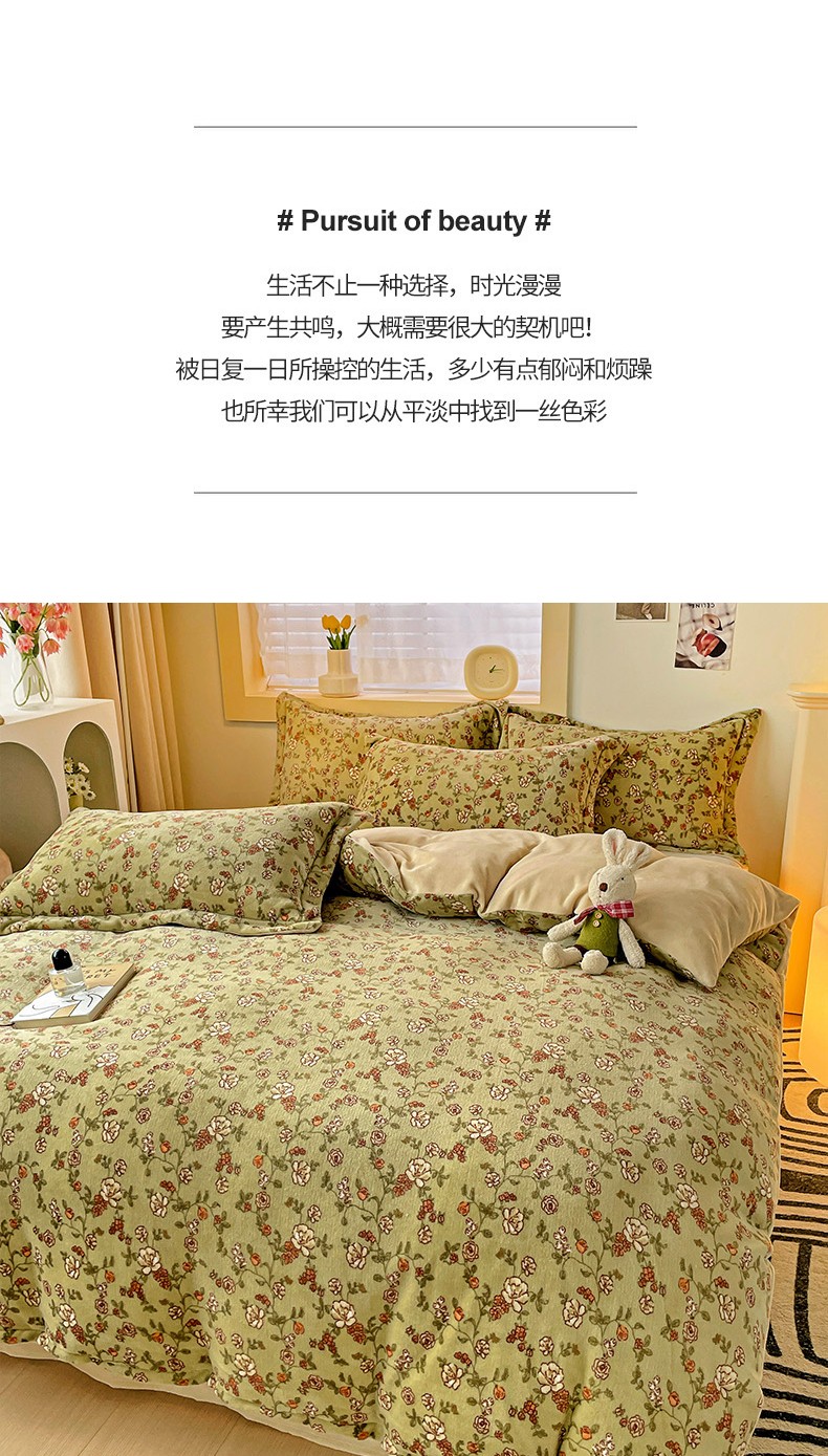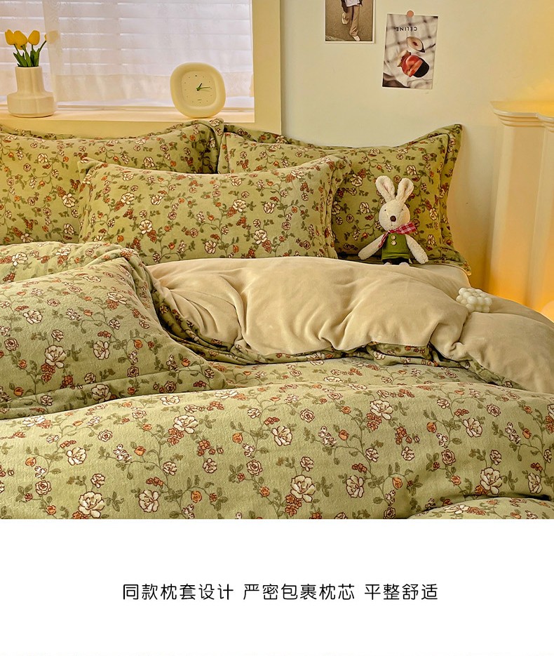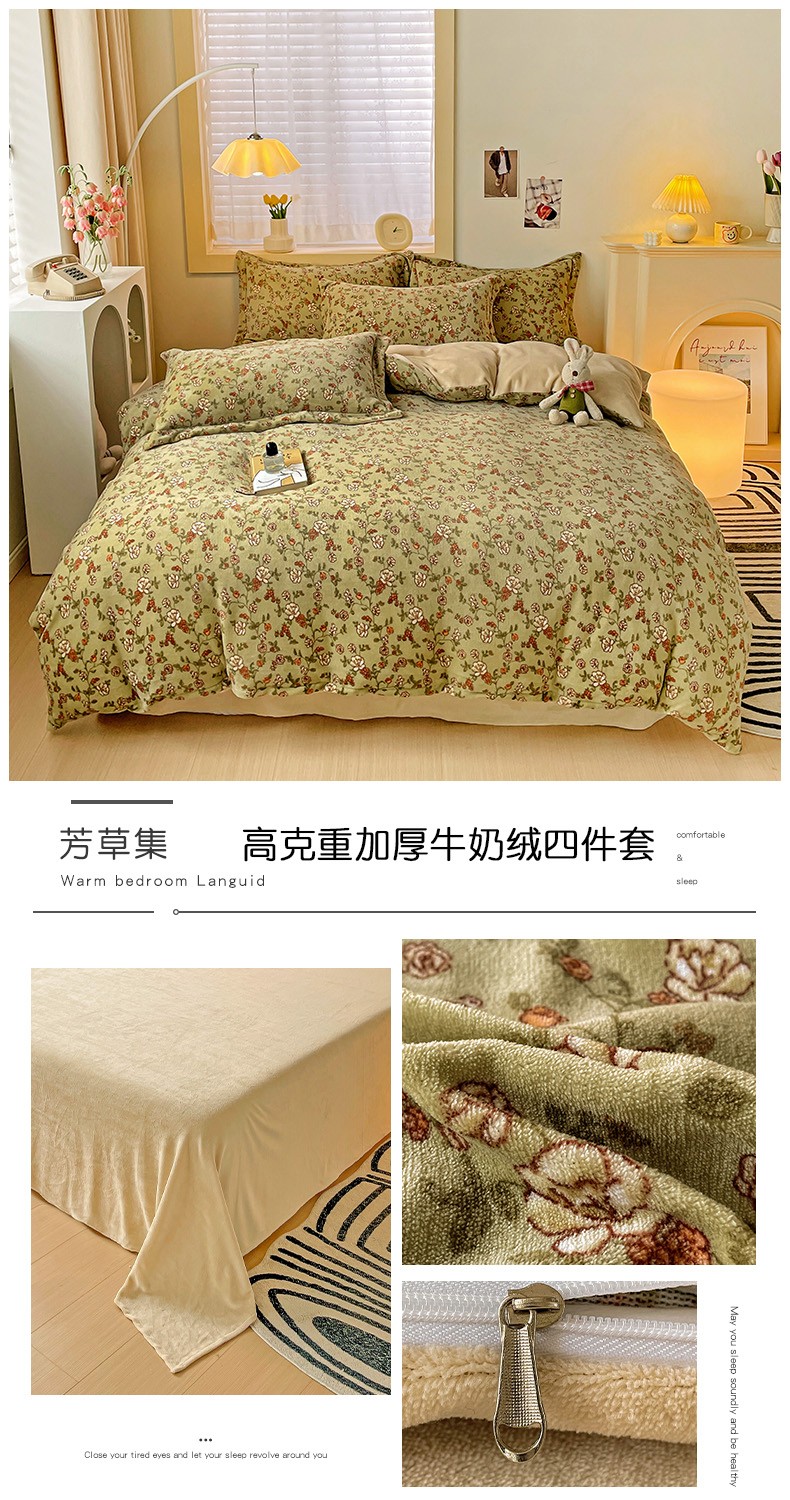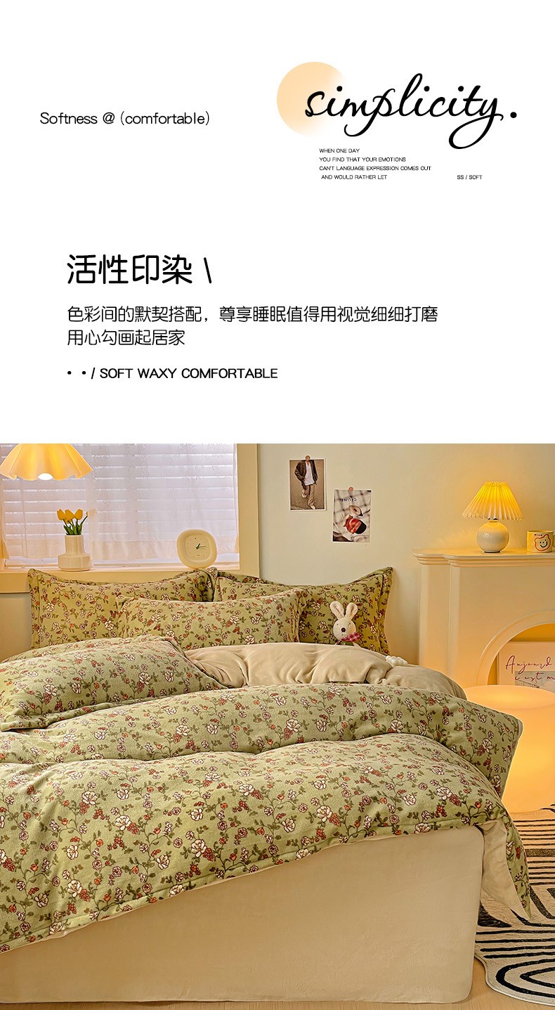 当前位置: 91家纺网 > 商品网购 > 床品套件 > 四件套 > 牛奶绒四件套 > 畅畅家纺 2023新款活性印花小清新AB版加厚高克重法莱绒牛奶绒四件套 芳草集