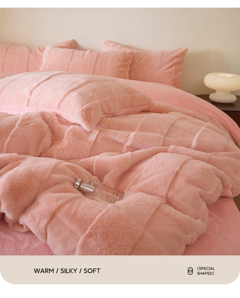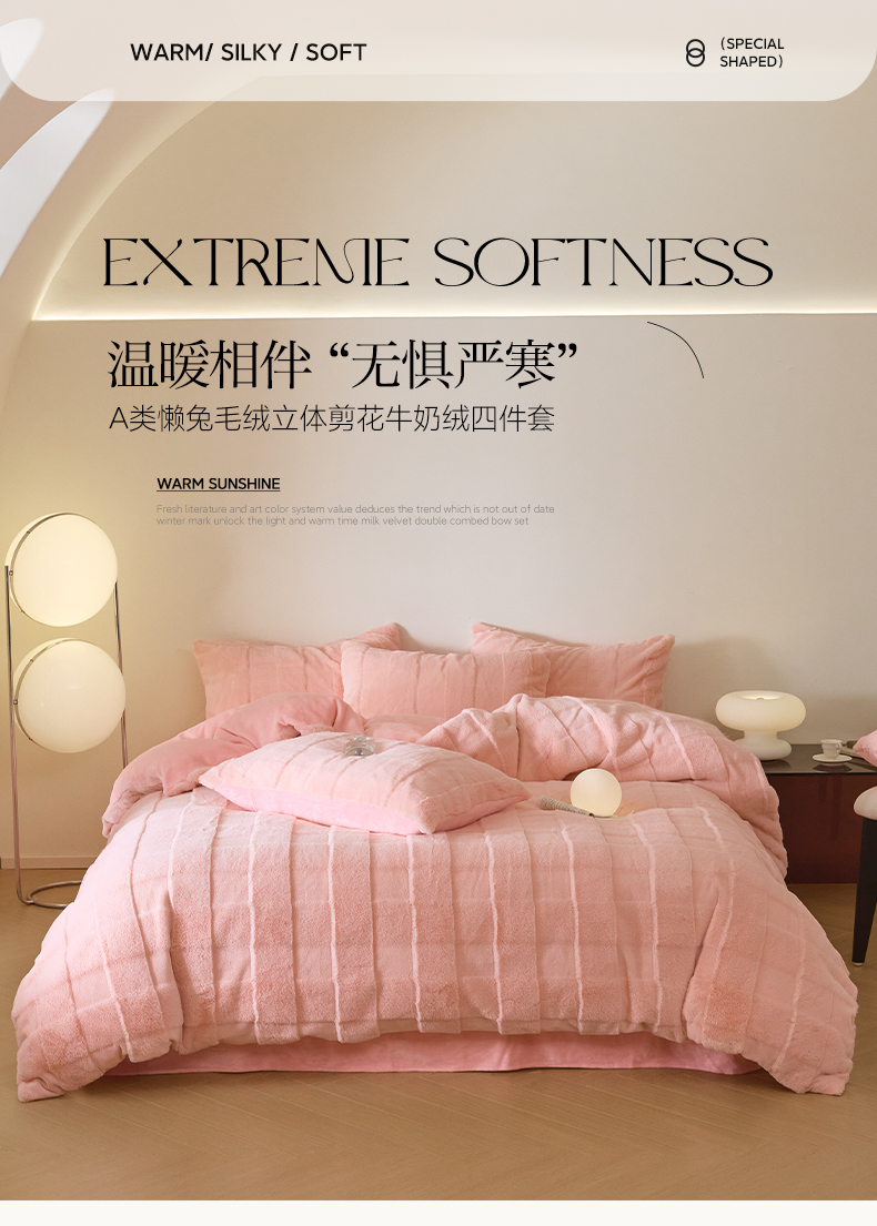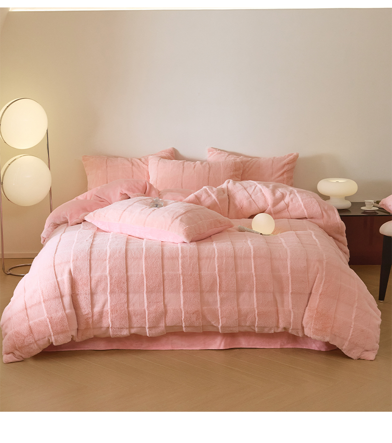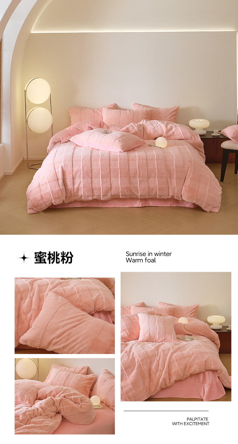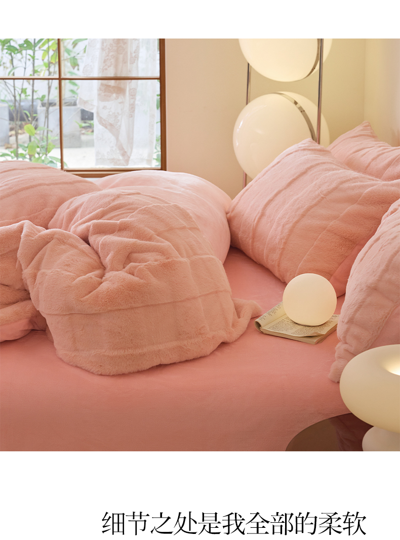 商品名称:民新 2024热款9斤獭兔毛绒兔兔绒剪花牛奶绒四件套-奢柔系列 蜜桃粉