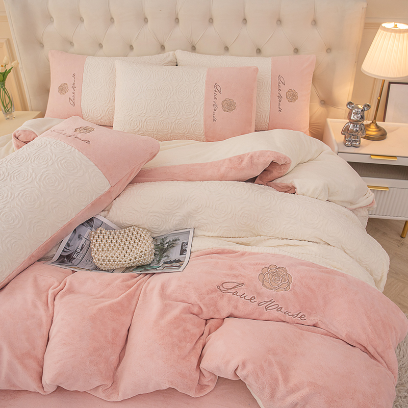 好阁 2023新款法式刺绣小香风雕花双拼牛奶绒四件套 奶芋色+可可粉