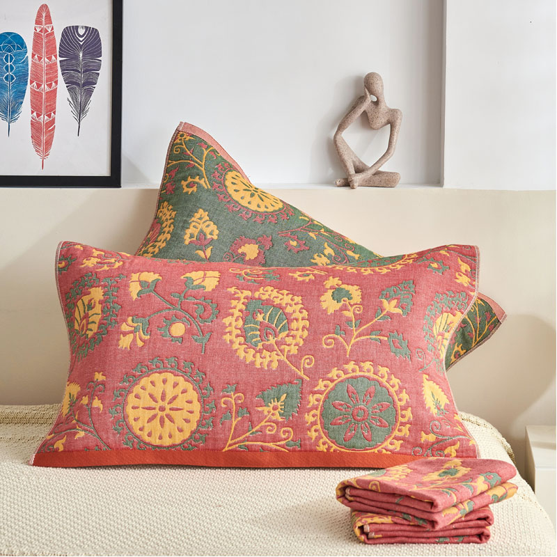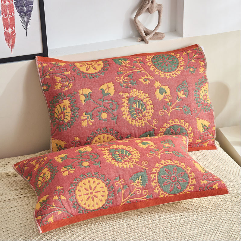 朴尔 2023年民族风彩棉系列四层纱布枕巾 花花世界红
