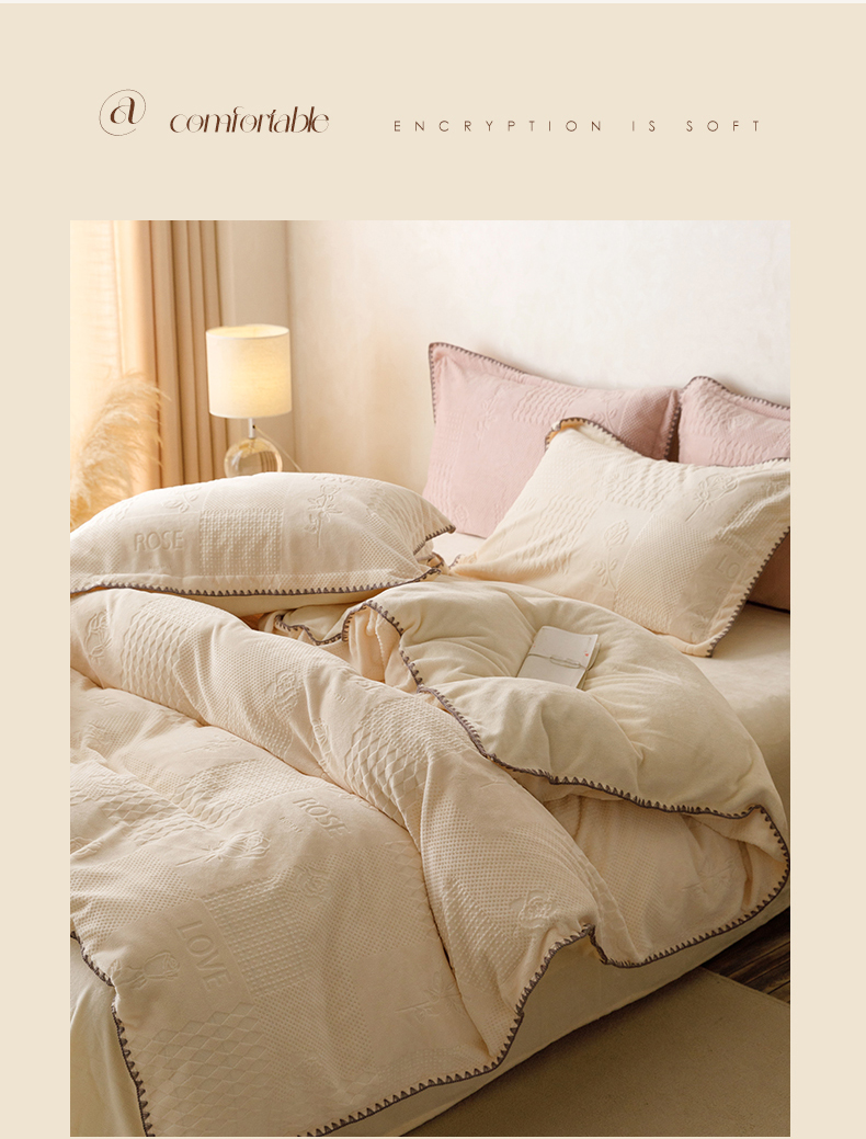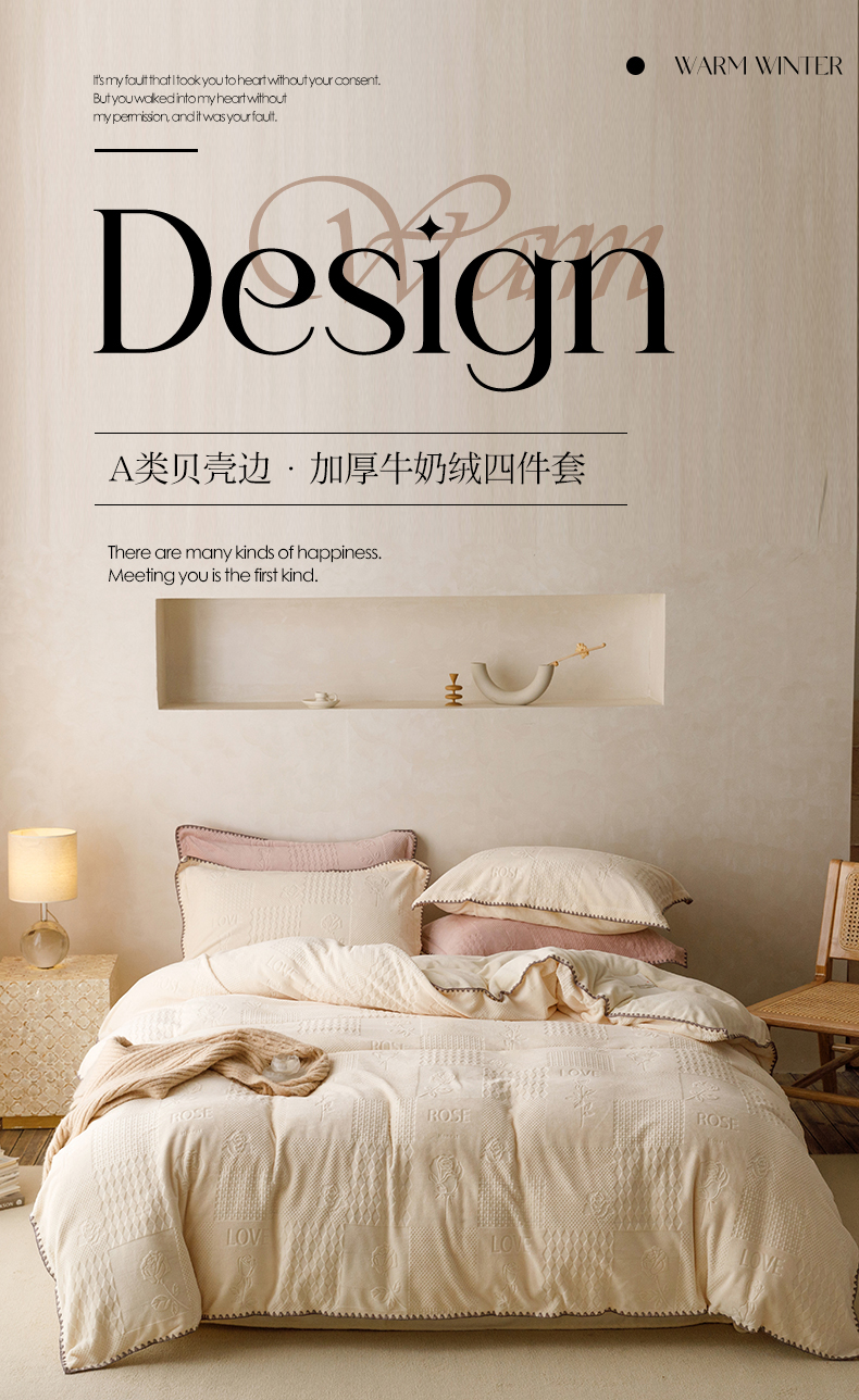 艾莱 2023新款贝壳边加厚牛奶绒四件套-玫瑰爱人 玫瑰爱人-米色