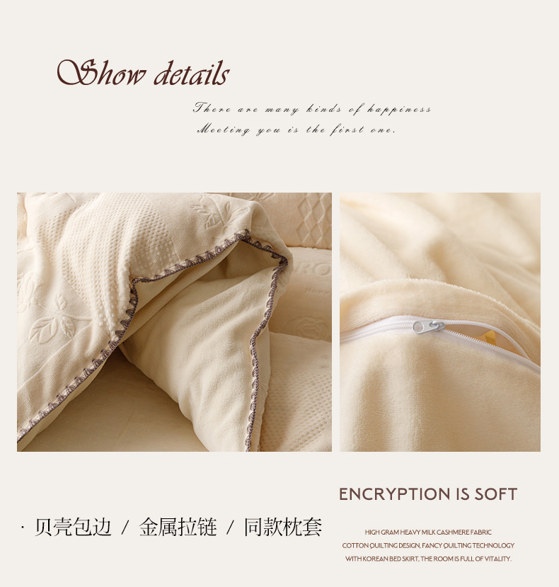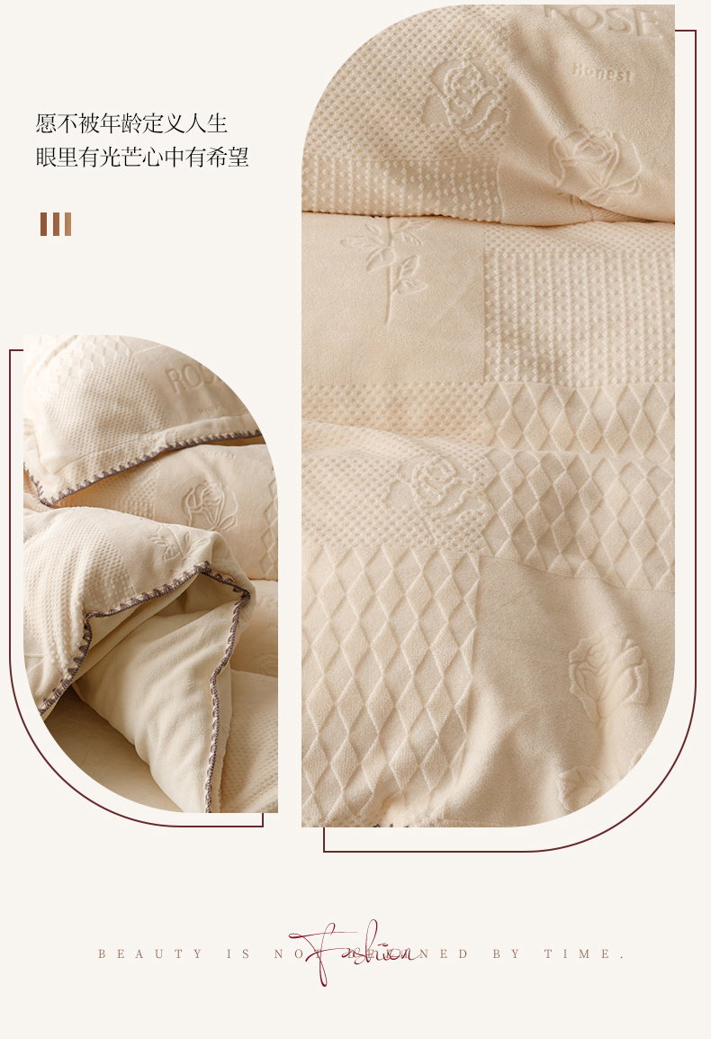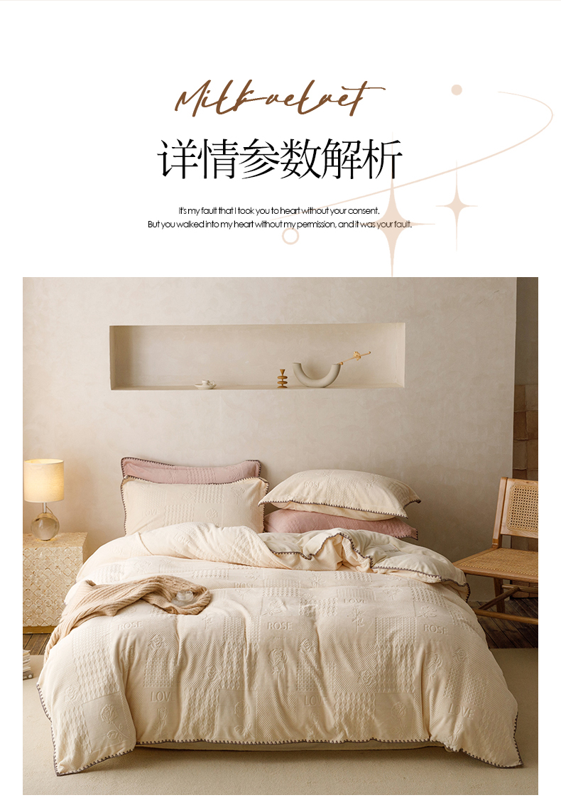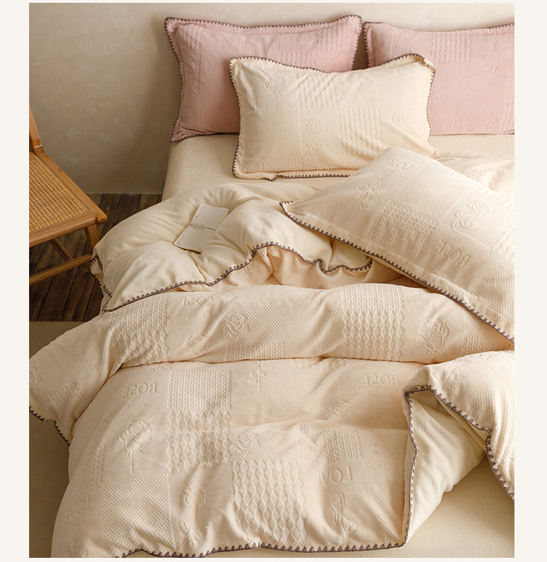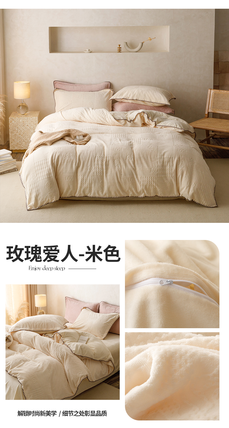 商品名称: 艾莱 2023新款贝壳边加厚牛奶绒四件套-玫瑰爱人 玫瑰爱人-米色