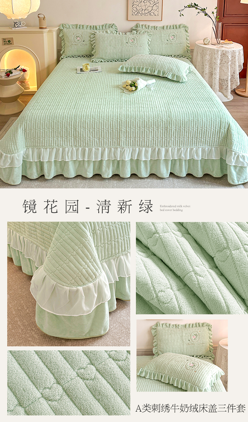 (总)宜凡家纺 2023新款高克重牛奶绒绣花夹棉床盖三件套