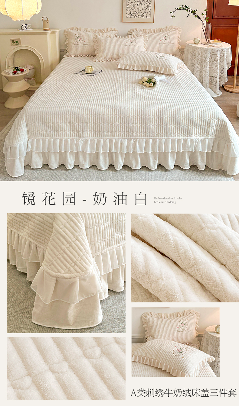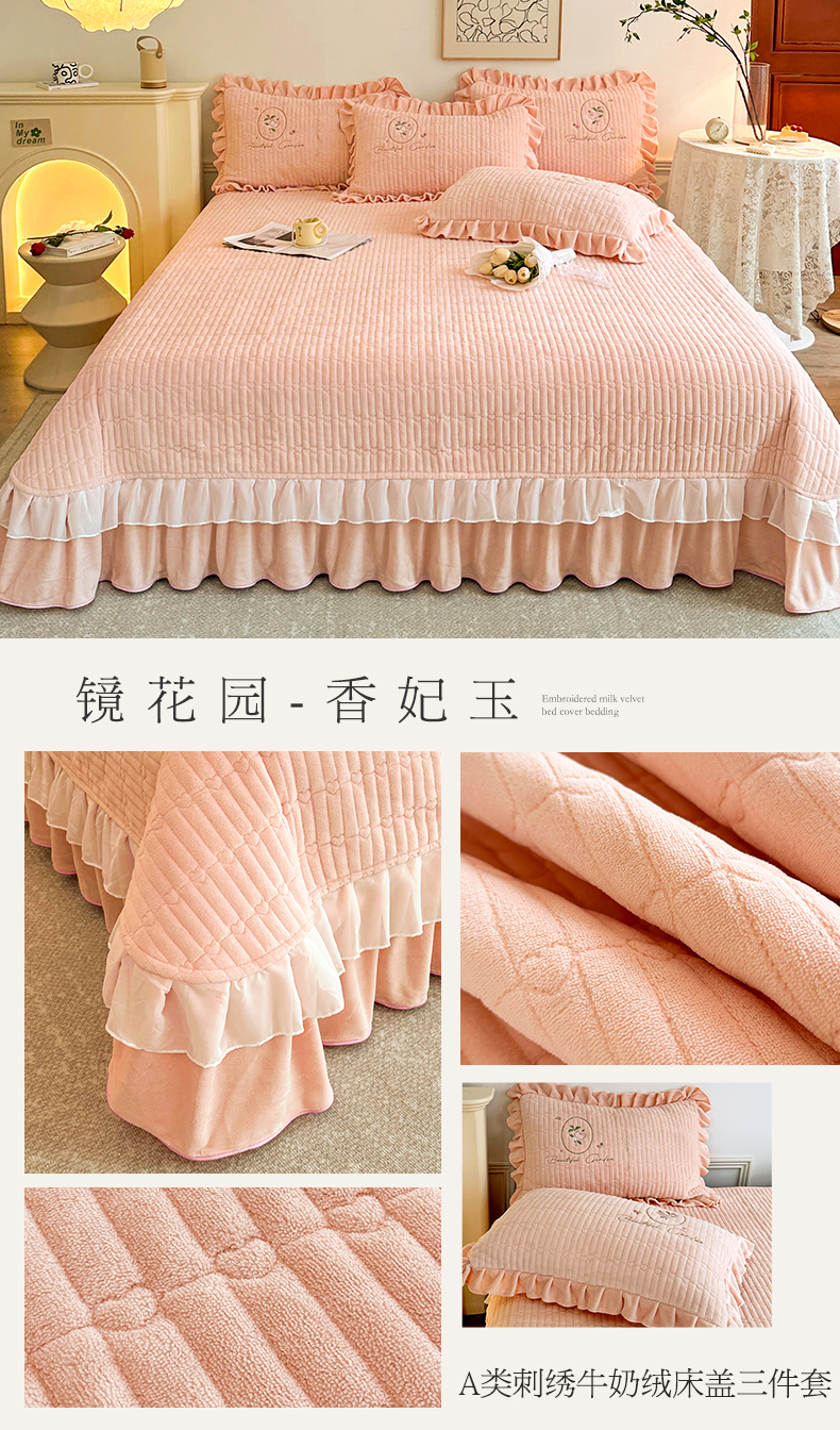 商品名称:(总)宜凡家纺 2023新款高克重牛奶绒绣花夹棉床盖三件套