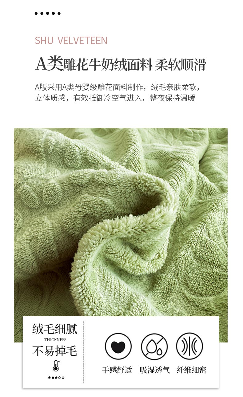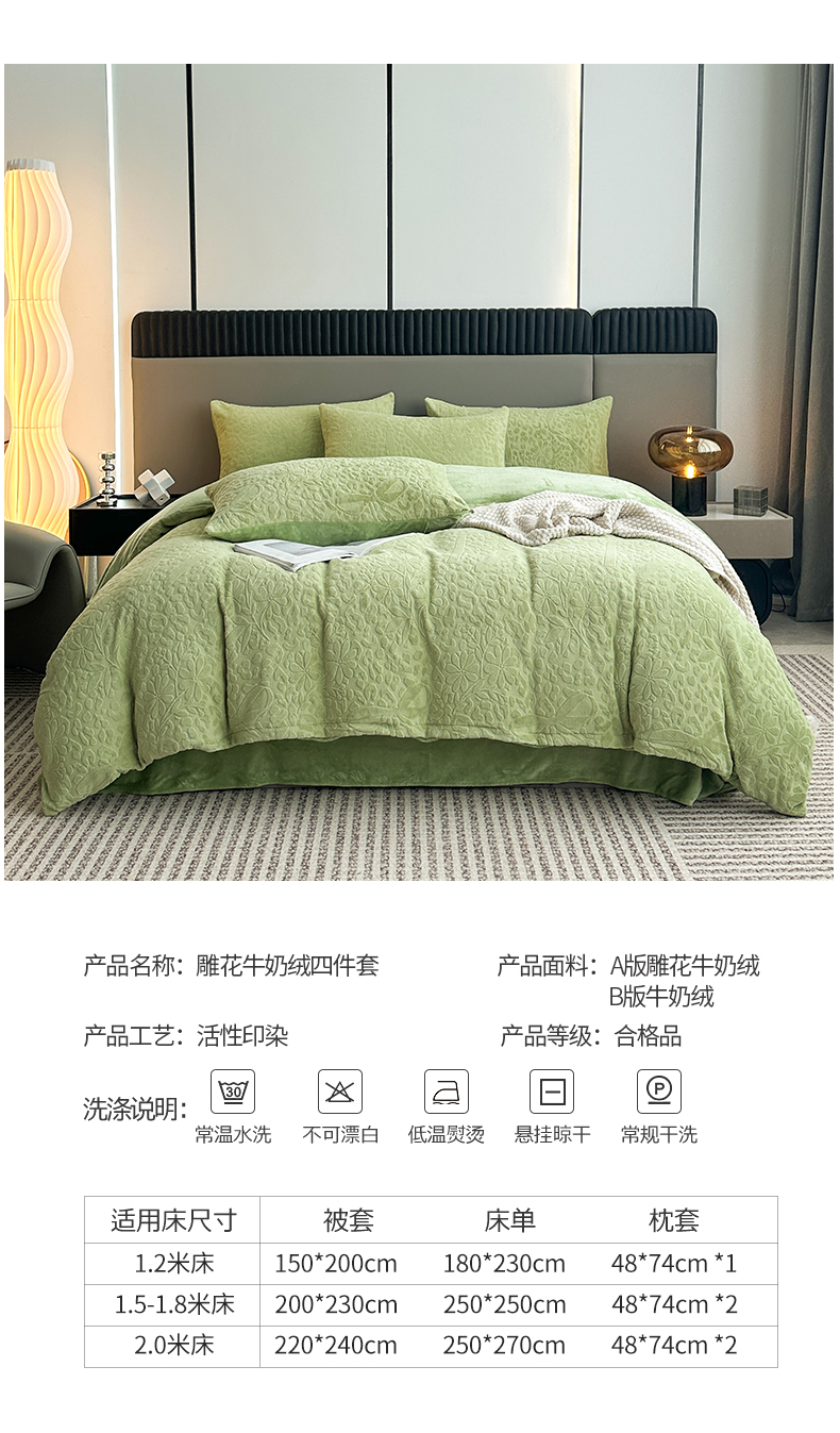 商品名称:铠畅家纺 2023爆款A类230g立体雕花牛奶绒四件套 飘逸绿