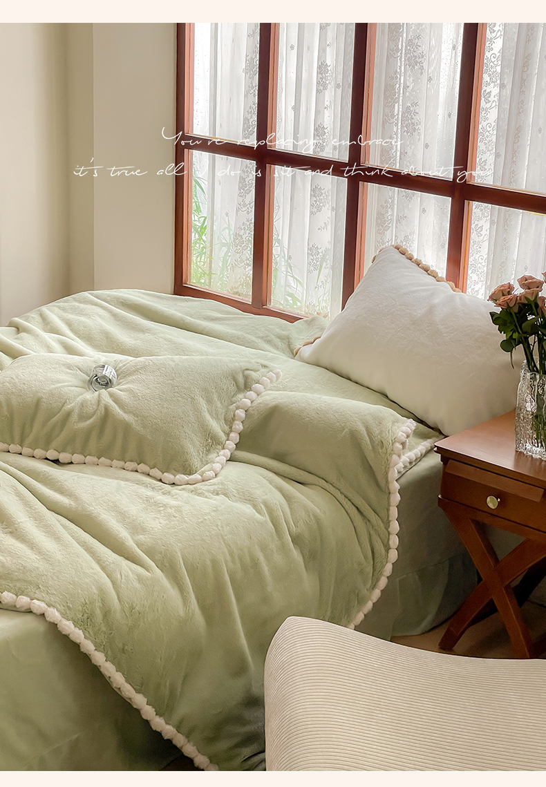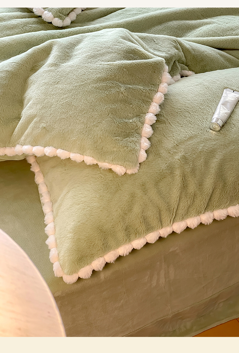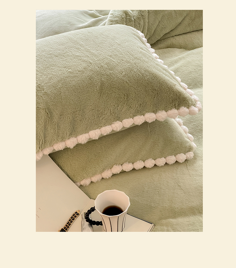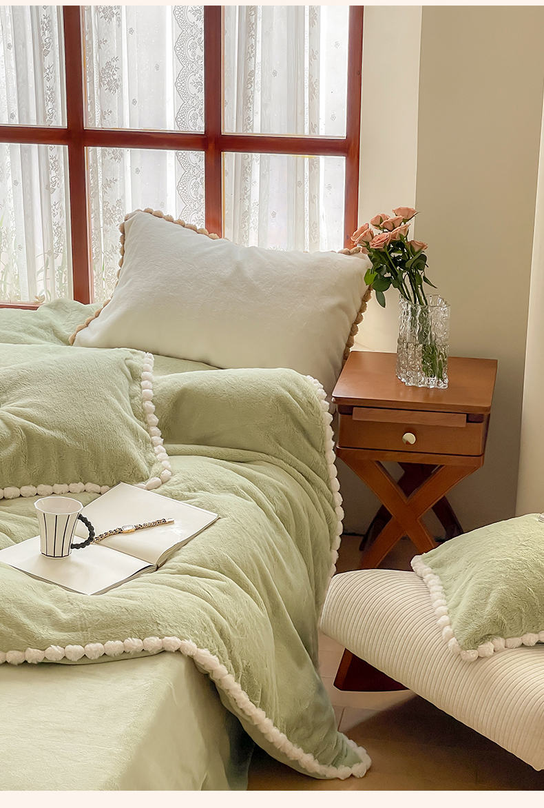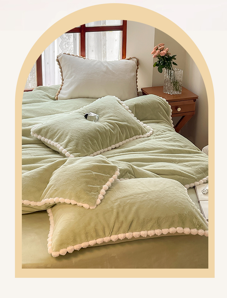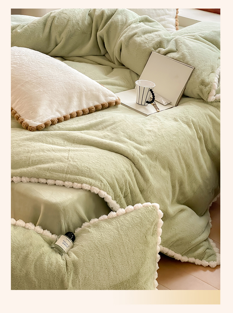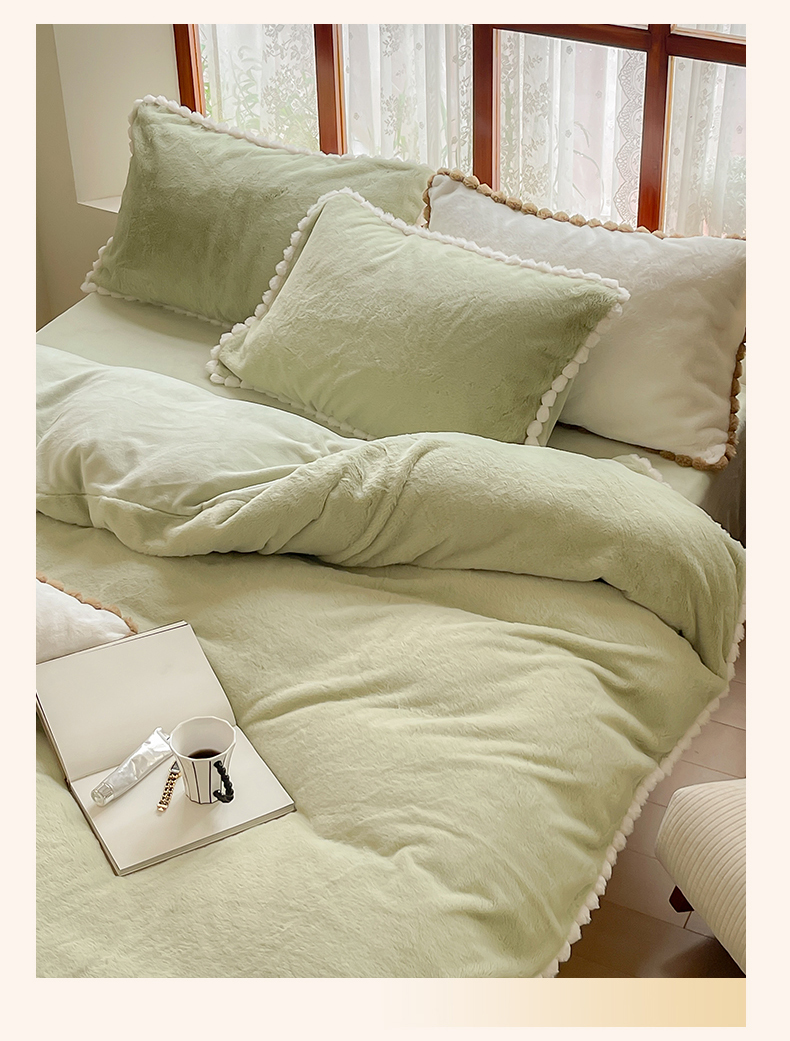 名品优仓 2023新款高克重兔绒边带球球款四件套 青稞绿