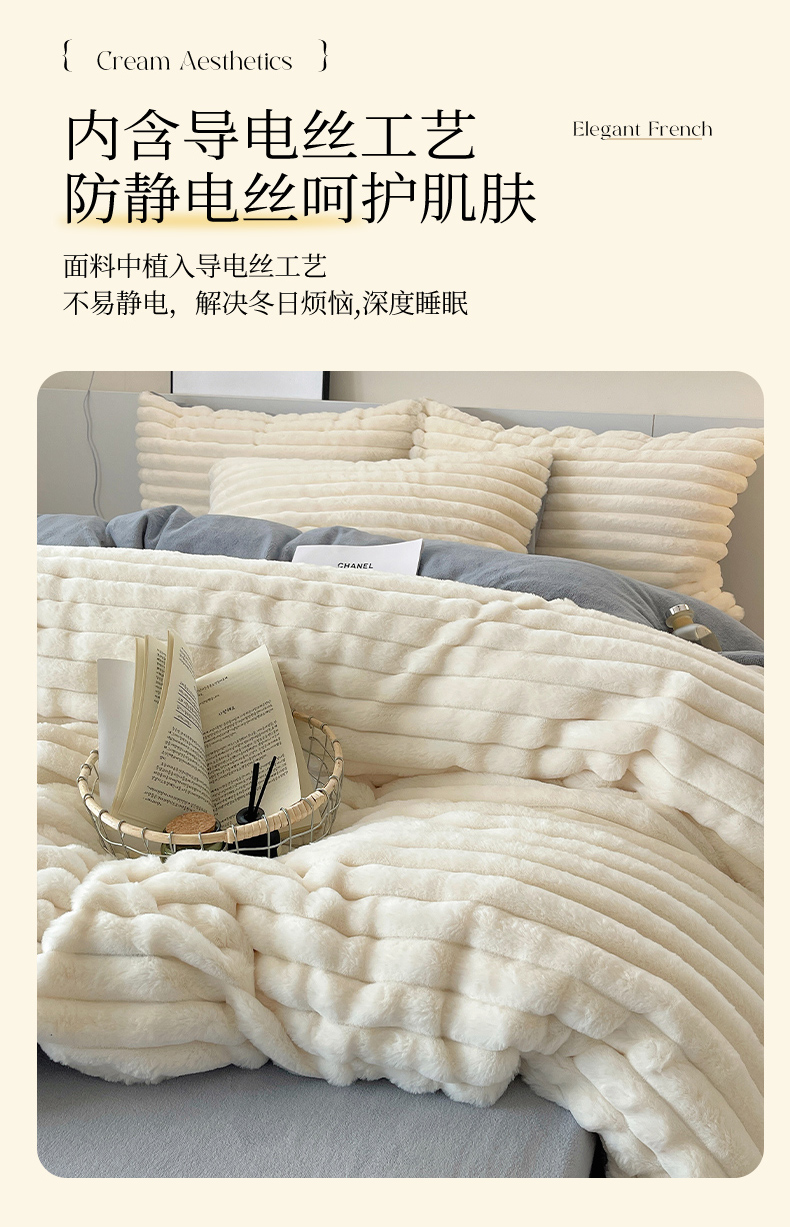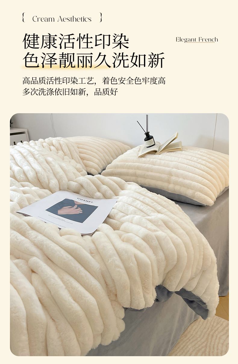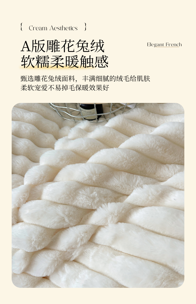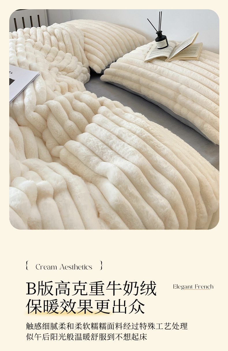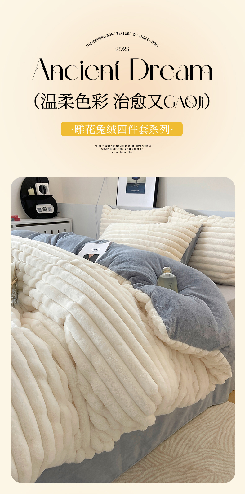 三朵家纺 2023新款加厚保暖雕花兔毛绒四件套 艾拉-米月白灰