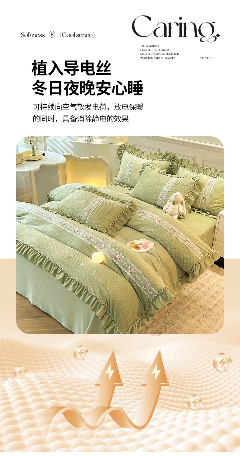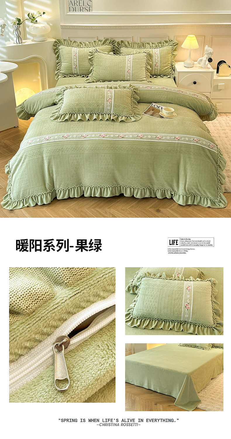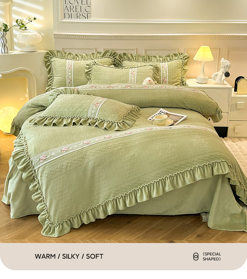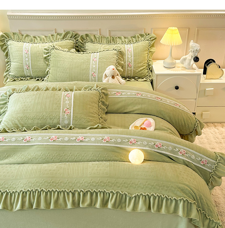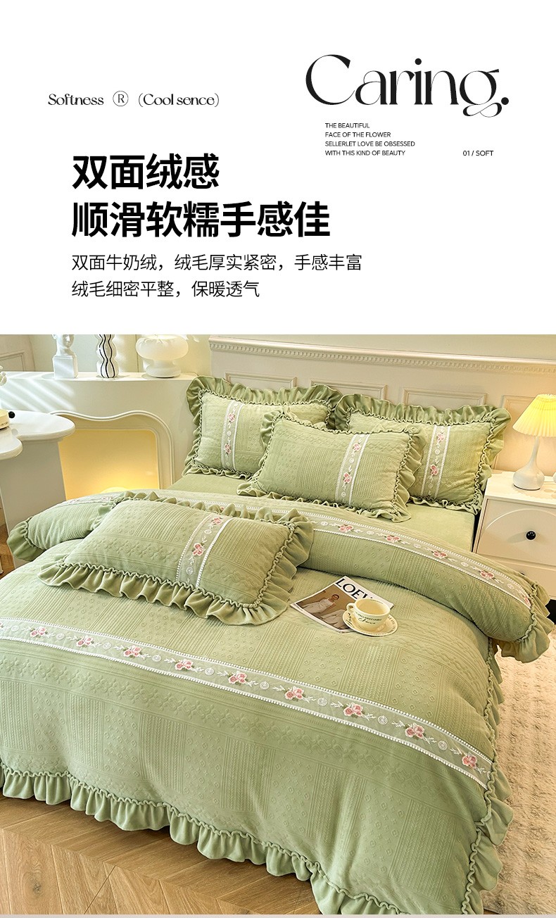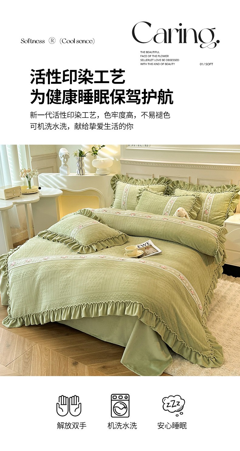 商品名称:芭比蔓 2024新款加厚牛奶绒雕花四件套--暖阳系列 果绿