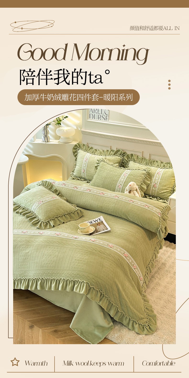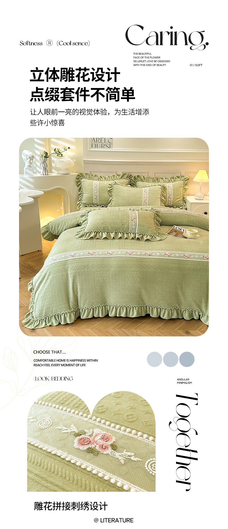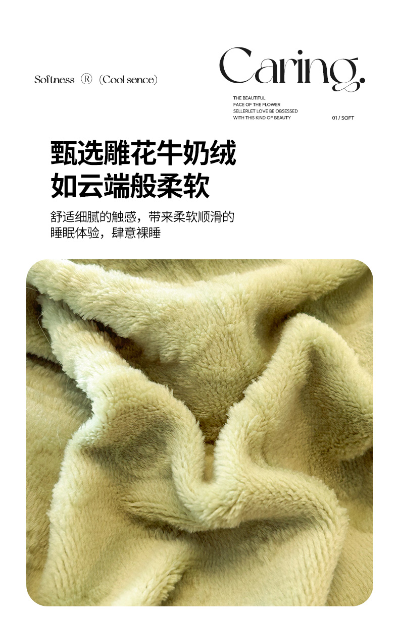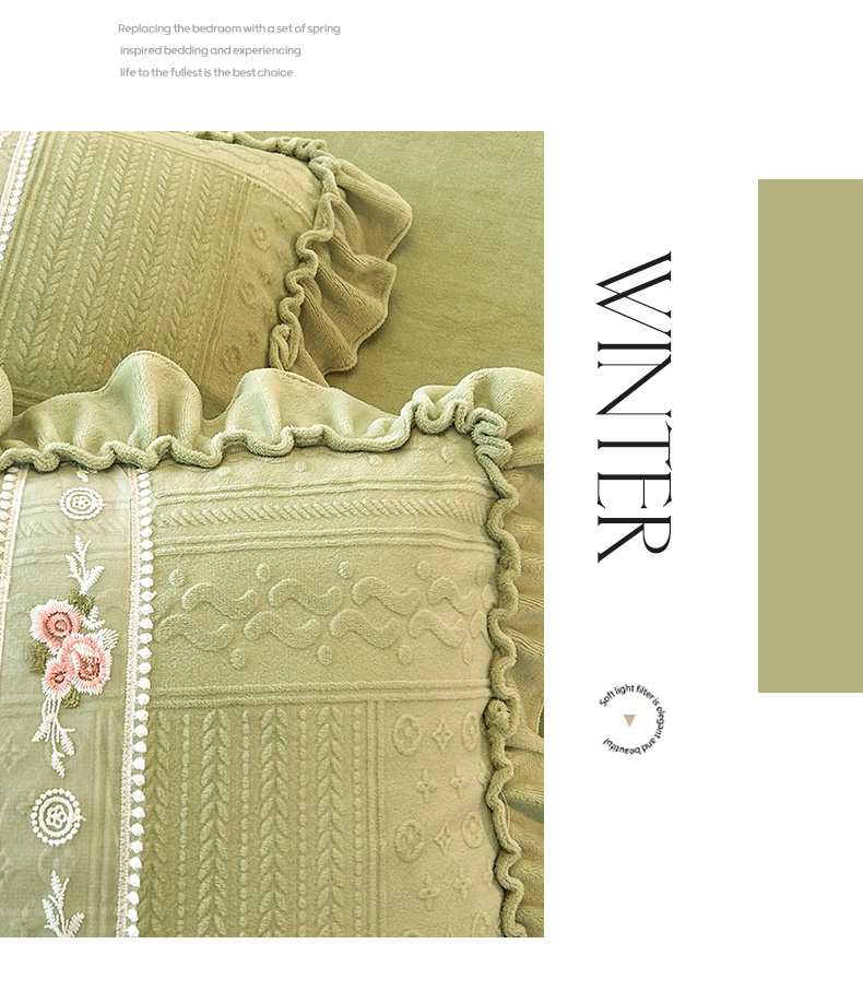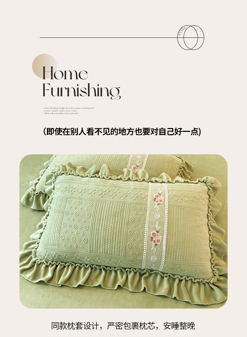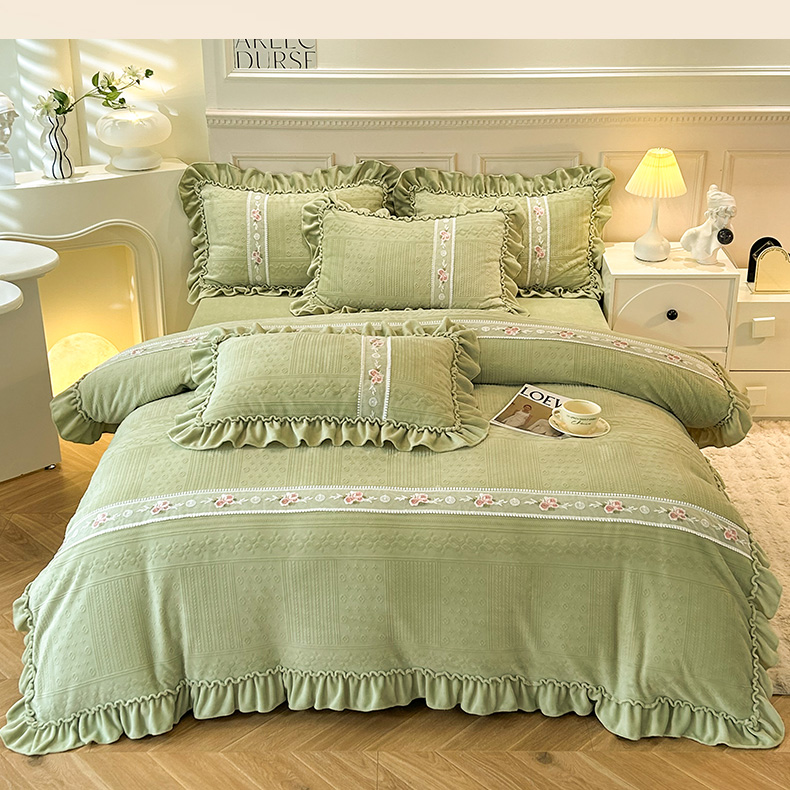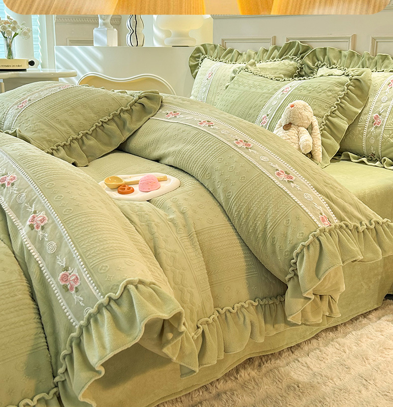 商品名称:芭比蔓 2024新款加厚牛奶绒雕花四件套--暖阳系列 果绿