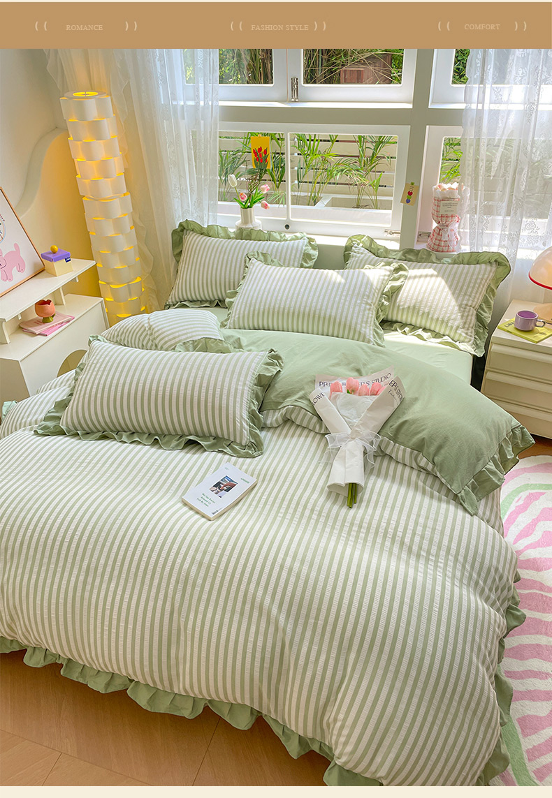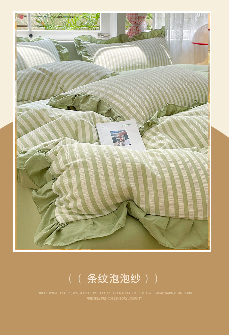 商品名称:苏木年华 2024新款水洗棉竖条纹泡泡纱小清新花边四件套 泡泡纱- 草绿