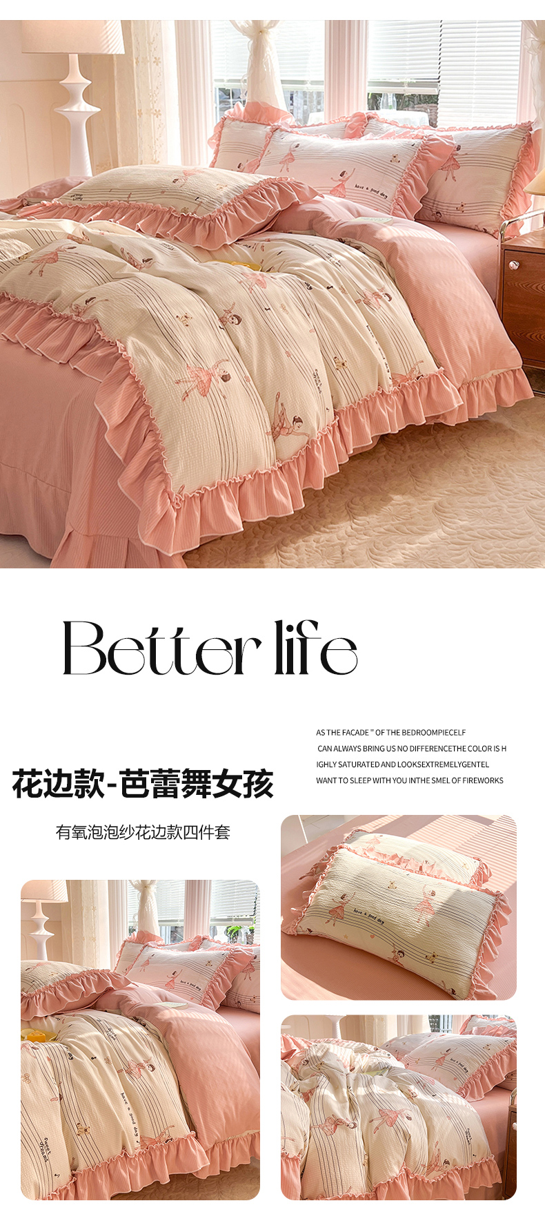 商品名称:慕梵家居 2024新款泡泡纱花边款四件套 花边款-芭蕾舞女孩