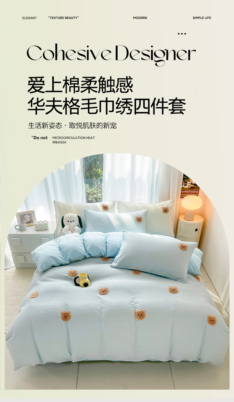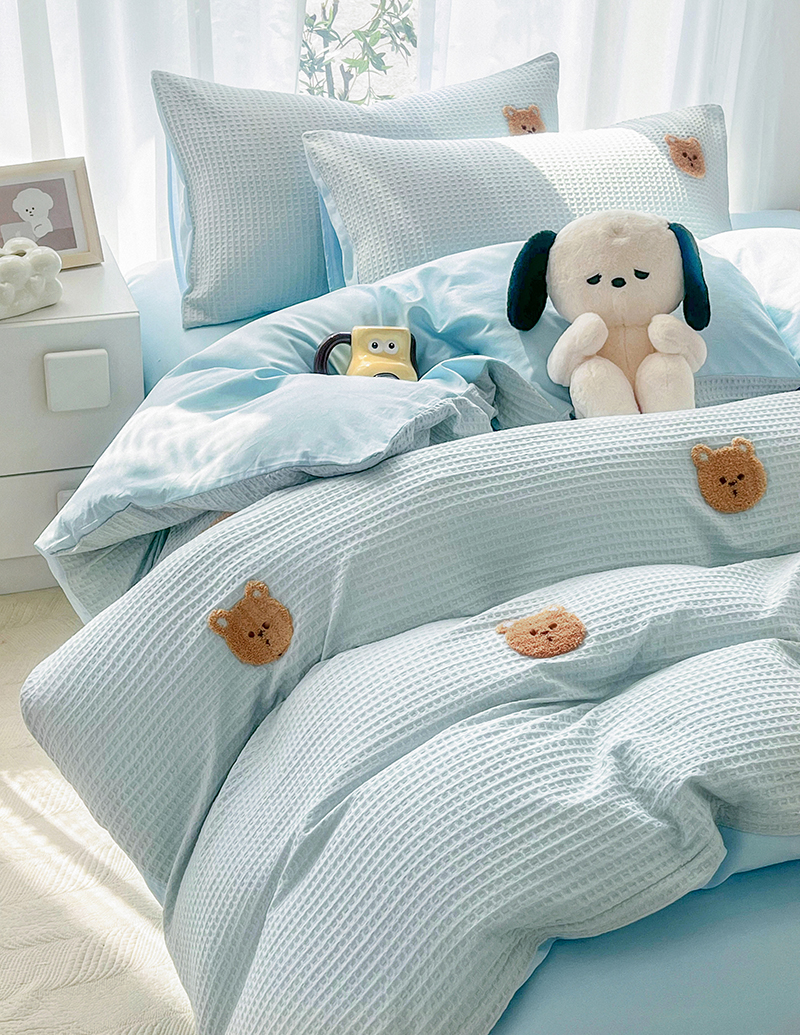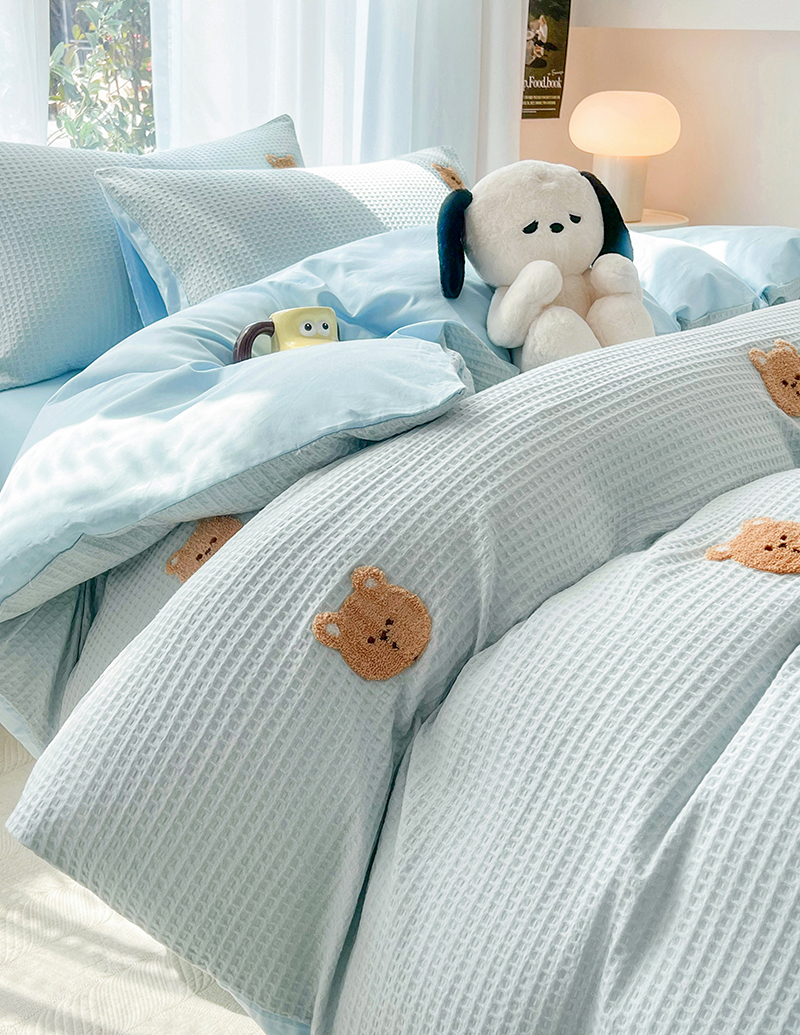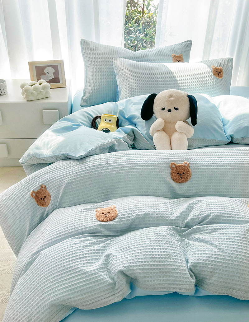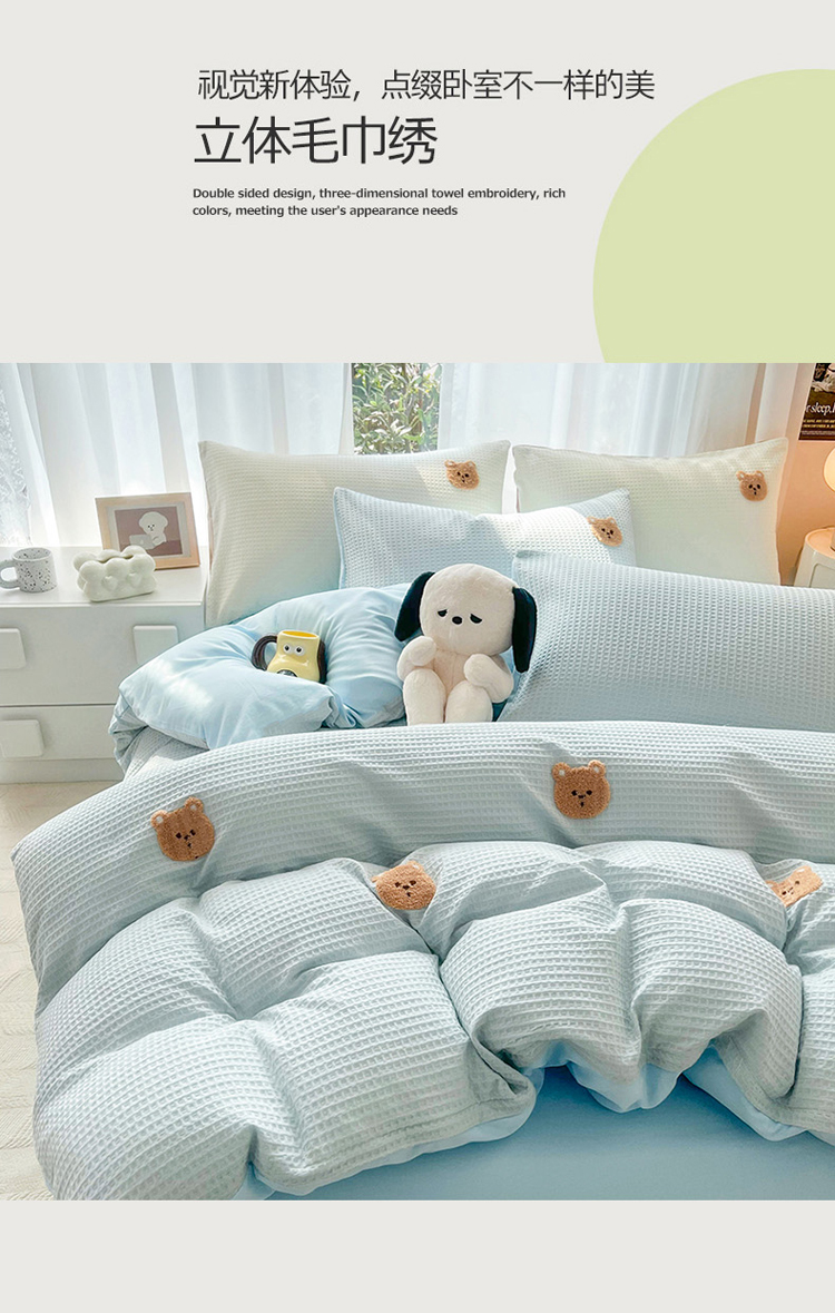 当前位置: 91家纺网 > 商品网购 > 床品套件 > 四件套 > 毛巾绣四件套 > 慕尚 2025新款全棉华夫格毛巾绣四件套 华夫格小熊仔蓝