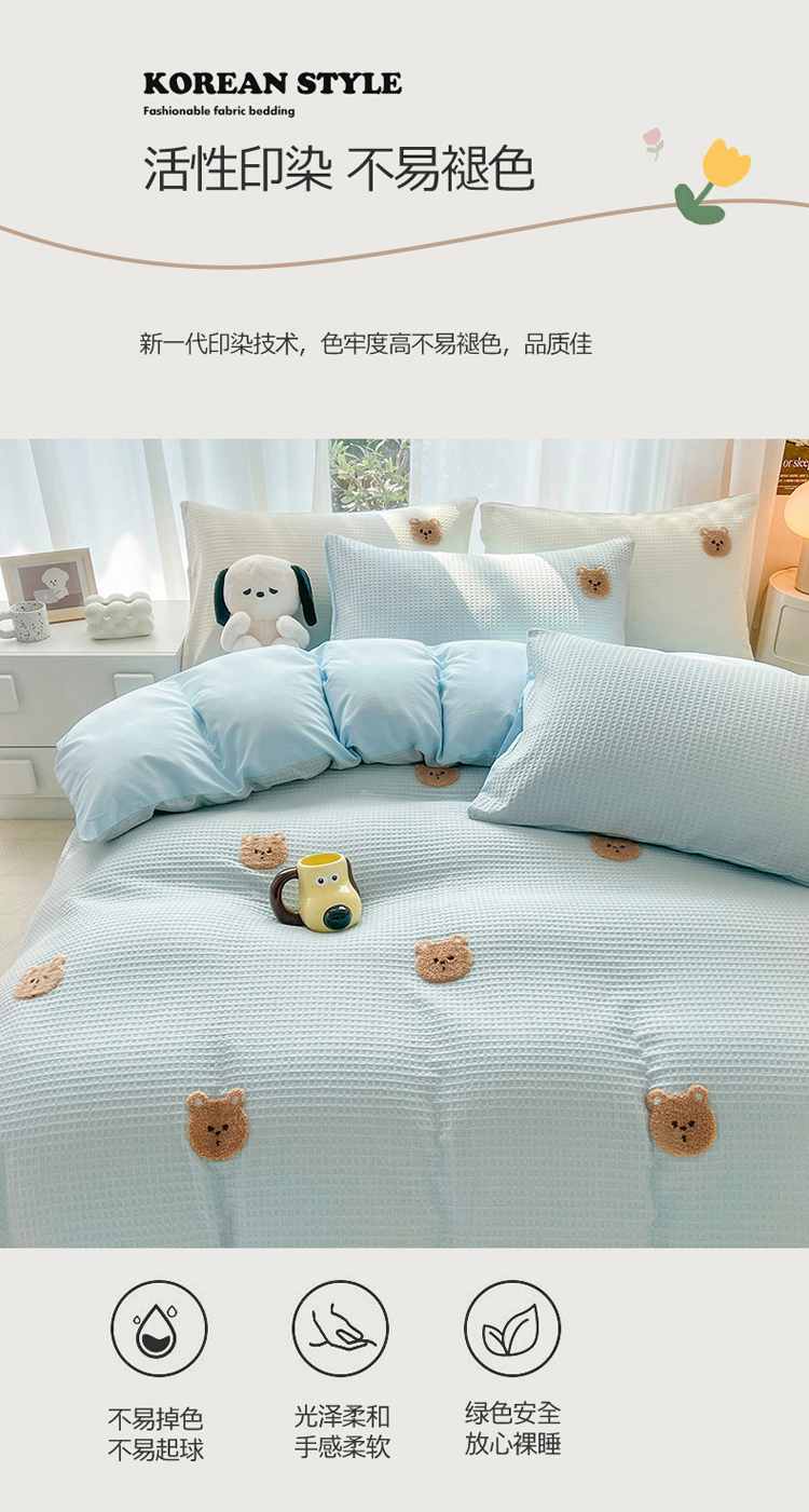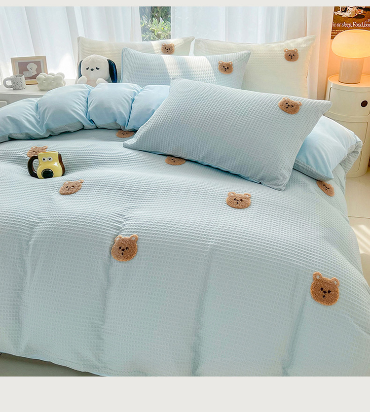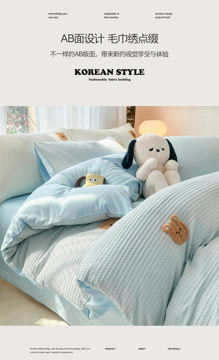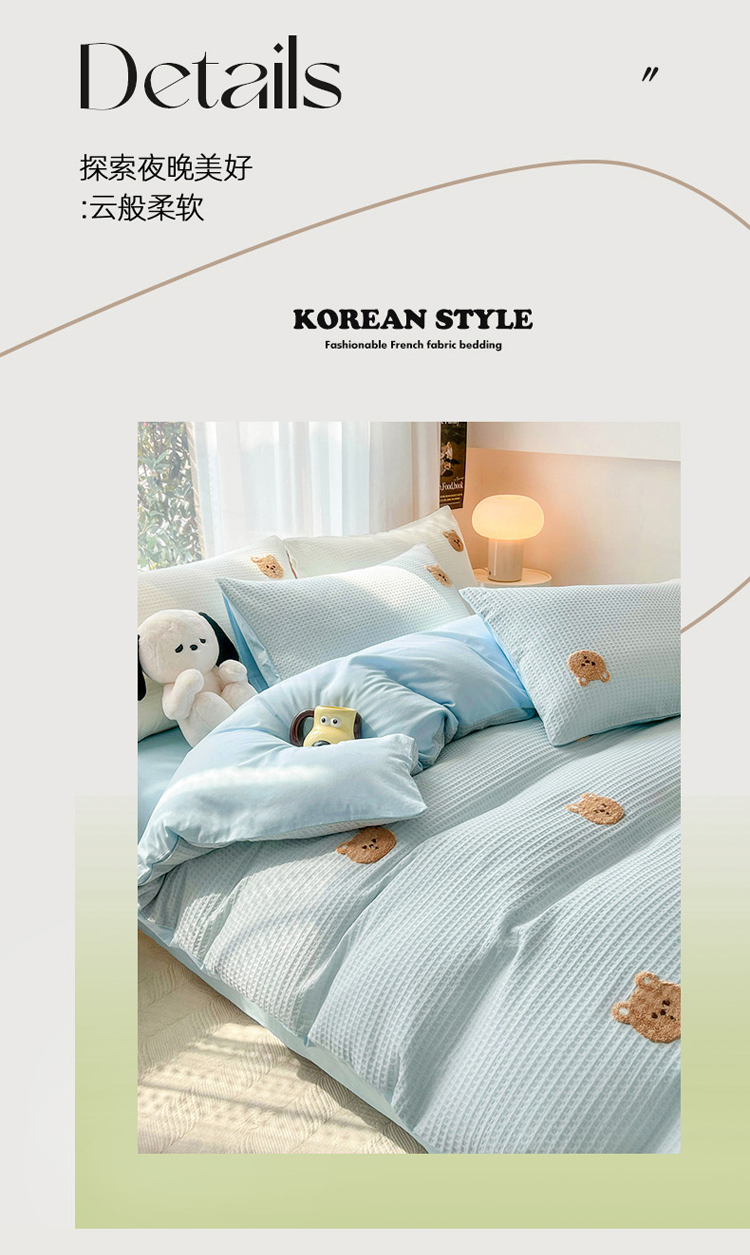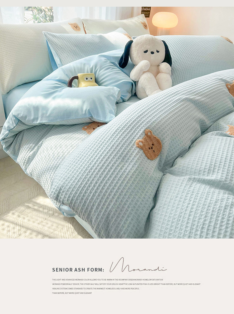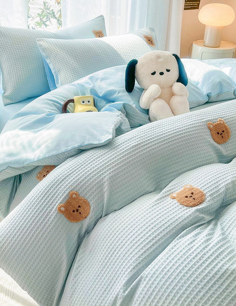 当前位置: 91家纺网 > 商品网购 > 床品套件 > 四件套 > 毛巾绣四件套 > 慕尚 2025新款全棉华夫格毛巾绣四件套 华夫格小熊仔蓝